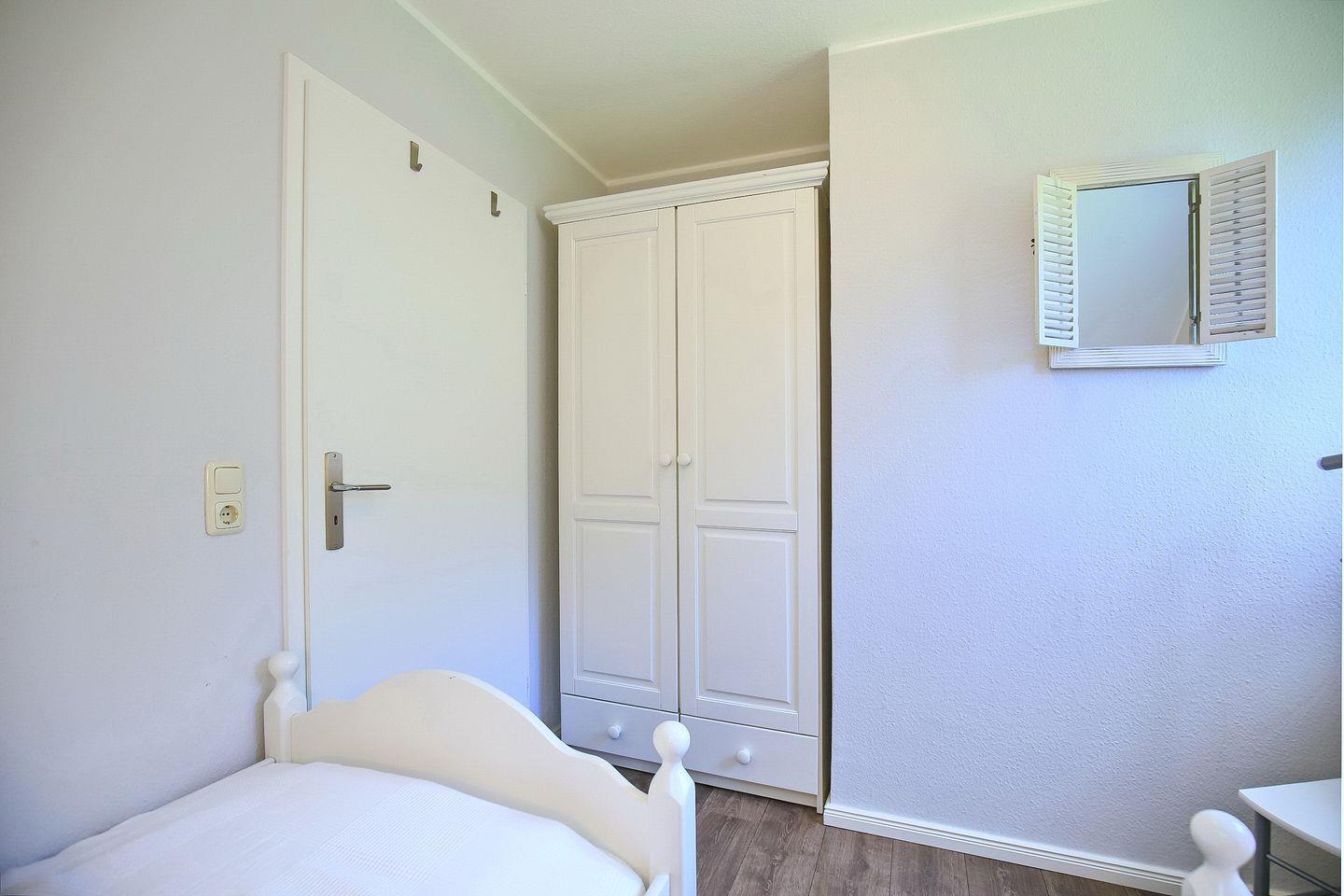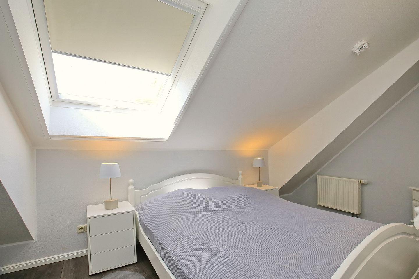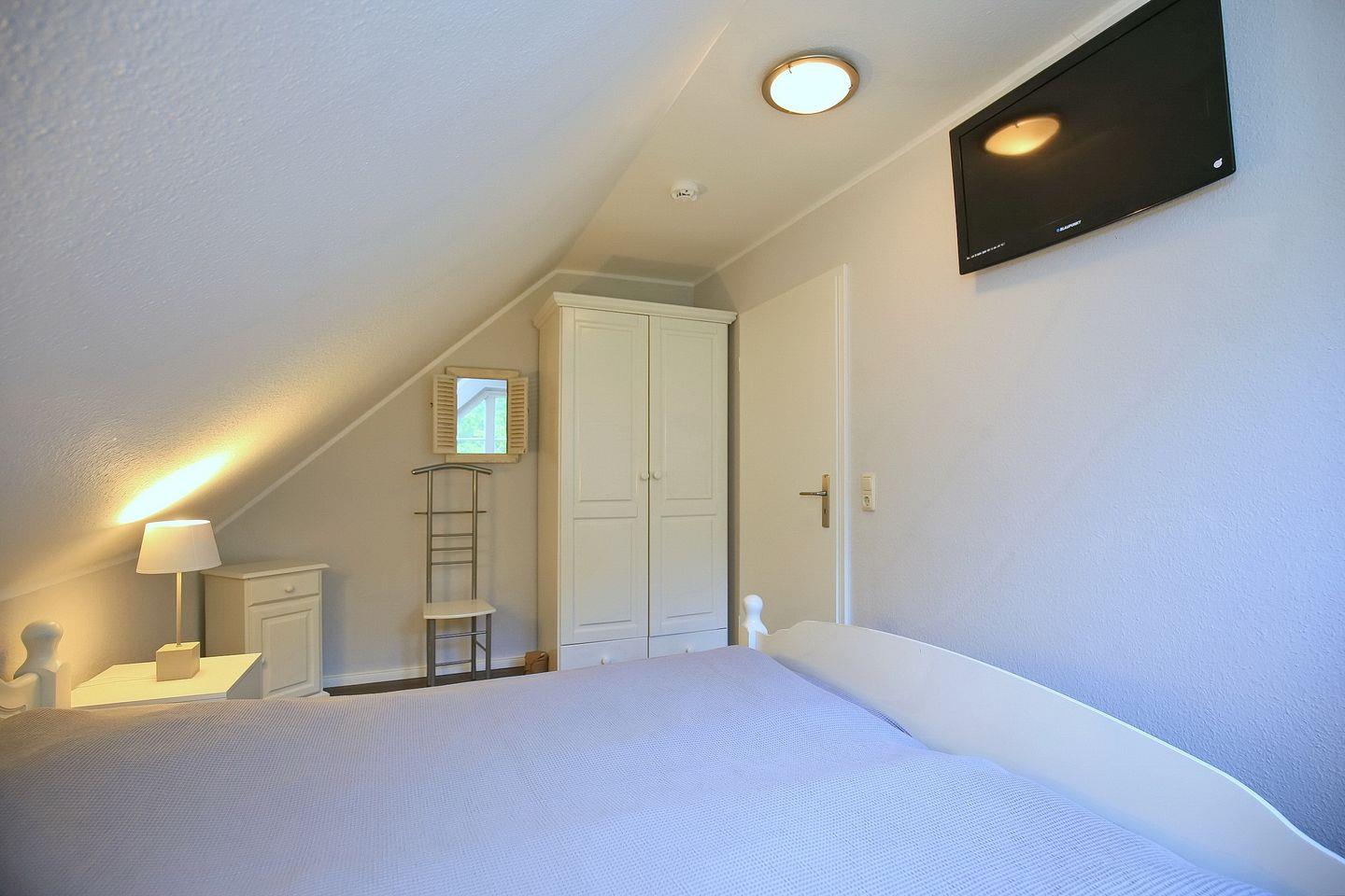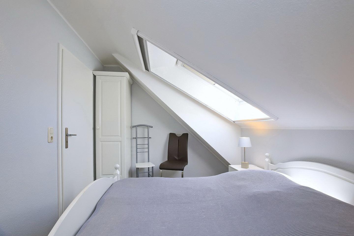Im Schlafzimmer des 1. OG findest du neben zwei Einzelbetten (90 x 200 cm) auch einen Kleiderschrank vor. Die zwei Schlafzimmer im Dachgeschoss erreichst du über eine innenliegende Treppe. Beide Schlafräume sind mit jeweils einem Doppelbett (2 x 90 x 200 cm und 2 x 80 x 200 cm) und einem Kleiderschrank eingerichtet. Hier kann ein zweiter Flachbild-TV genutzt werden. Zur Verdunkelung gibt es Rollos und teilweise Außenjalousien an den Fenstern. Für unsere kleinen Gäste steht ein Reisebett zur Verfügung. In allen Schlafzimmern ist Laminat verlegt.