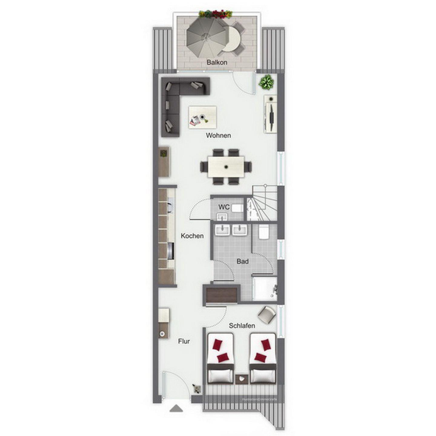 Das helle Wohnzimmer auf der unteren Ebene ist mit einer bequemen Eck-Couch und einem gemütlichen Essbereich für sechs Personen ausgestattet. Auch ein Kinderhochstuhl gehört zur Ausstattung. Aus dem Wohnbereich gelangst du auf den möblierten Balkon, von dem aus du ins Grüne blicken kannst. Für Abwechslung am Abend sorgen ein Flachbild-TV und eine Stereoanlage.