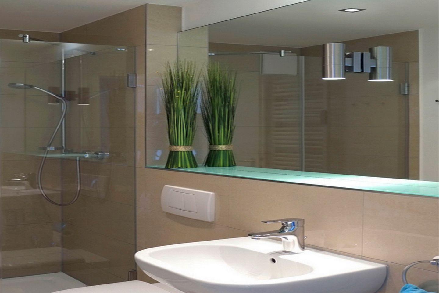 Das neu gestaltete, helle Duschbad bietet einen extra großen Spiegel, einen großzügigen Duschbereich mit flachem Einstieg und eine Handtuchheizung.