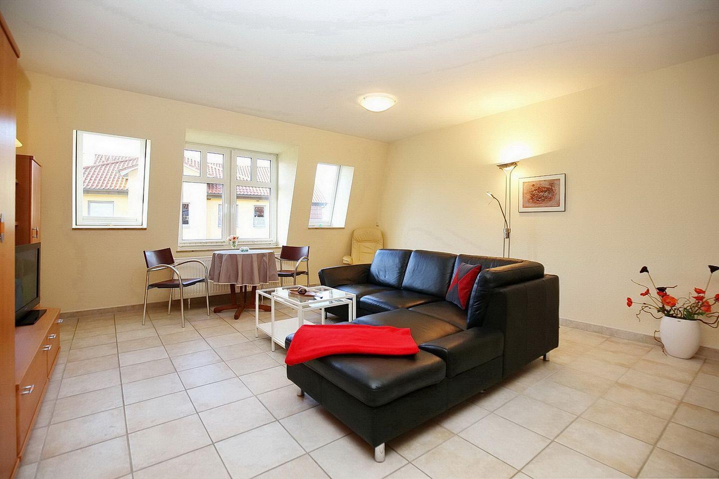 Auf der bequemen Leder-Eckcouch kannst du nach langen Strandtagen entspannen oder den einladenden Lesesessel nutzen, um den Tag bei einem guten Buch ausklingen zu lassen. Ein TV-Flatscreen nebst DVD-Player und eine Stereoanlage mit USB- sowie iPod/iPhone-Schnittstelle bieten umfangreiche Unterhaltung. WLAN (ohne Gewähr) kannst du kostenfrei nutzen. Zum Schlafen steht dir ein Schrank-Doppelbett (2 x 80 x 200 cm) zur Verfügung, das sich einfach und leicht öffnen und schließen lässt. So hast du tagsüber viel Platz in deiner Ferienwohnung. Als Sichtschutz wurden im Wohnzimmer Plissees verwendet.