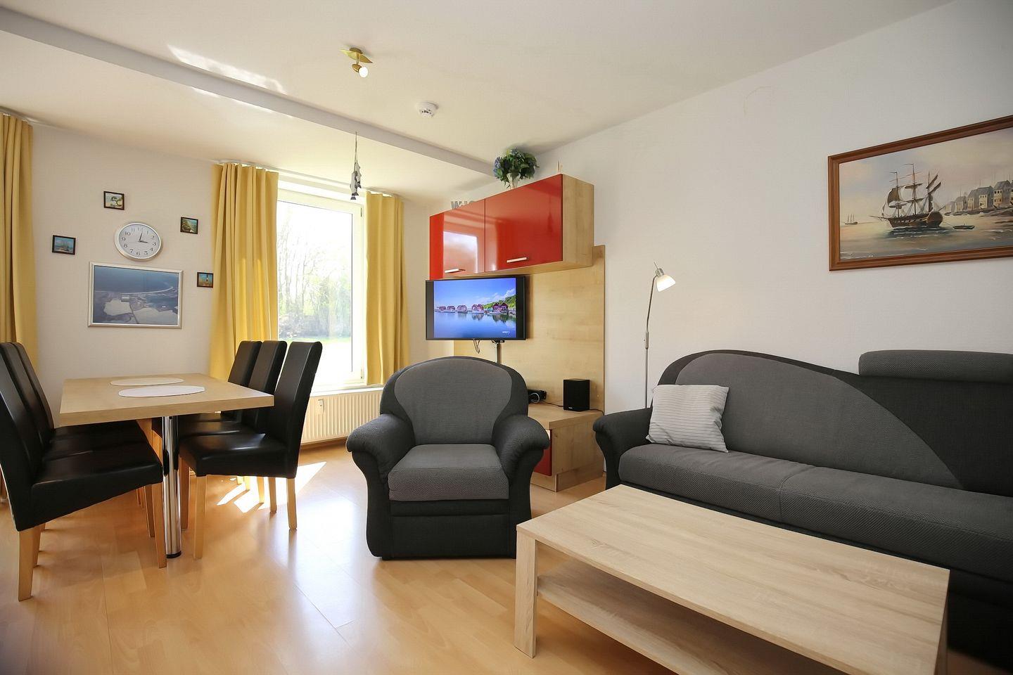 Die möblierte Terrasse in Süd-Ost-Lage erreichst du vom hellen Wohnbereich. Sie bietet dir puren Urlaubsgenuss. Im Wohnzimmer findest du eine gemütliche Doppelschlafcouch (120 x 180 cm) und einen modernen Essbereich vor. Zur Unterhaltung sorgen hier ein Flachbild-TV und eine Stereoanlage mit CD-Funktion. Der Boden ist mit Laminat ausgelegt.