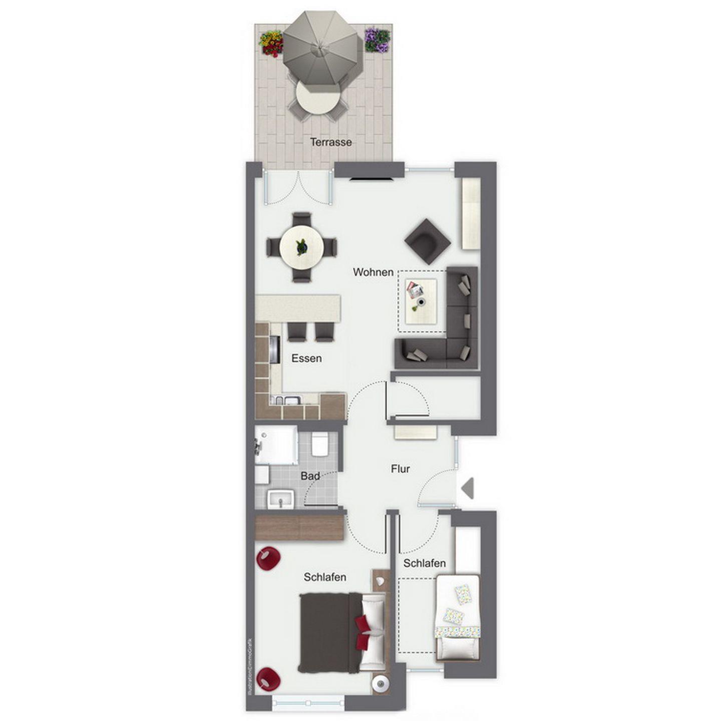 Auf ca. 59 m² kannst du in dieser 3-Zi.-Wohnung deinen Urlaub genießen. Die freundlich eingerichtete Ferienwohnung ist über einen separaten Eingang zu erreichen. Du findest ein helles Wohnzimmer mit Essbereich, eine Küchenzeile, zwei Schlafzimmer, ein Duschbad und eine Terrasse vor. Die Entfernung zum Strand beträgt von der Anlage Sünnslag ca. 400 m.