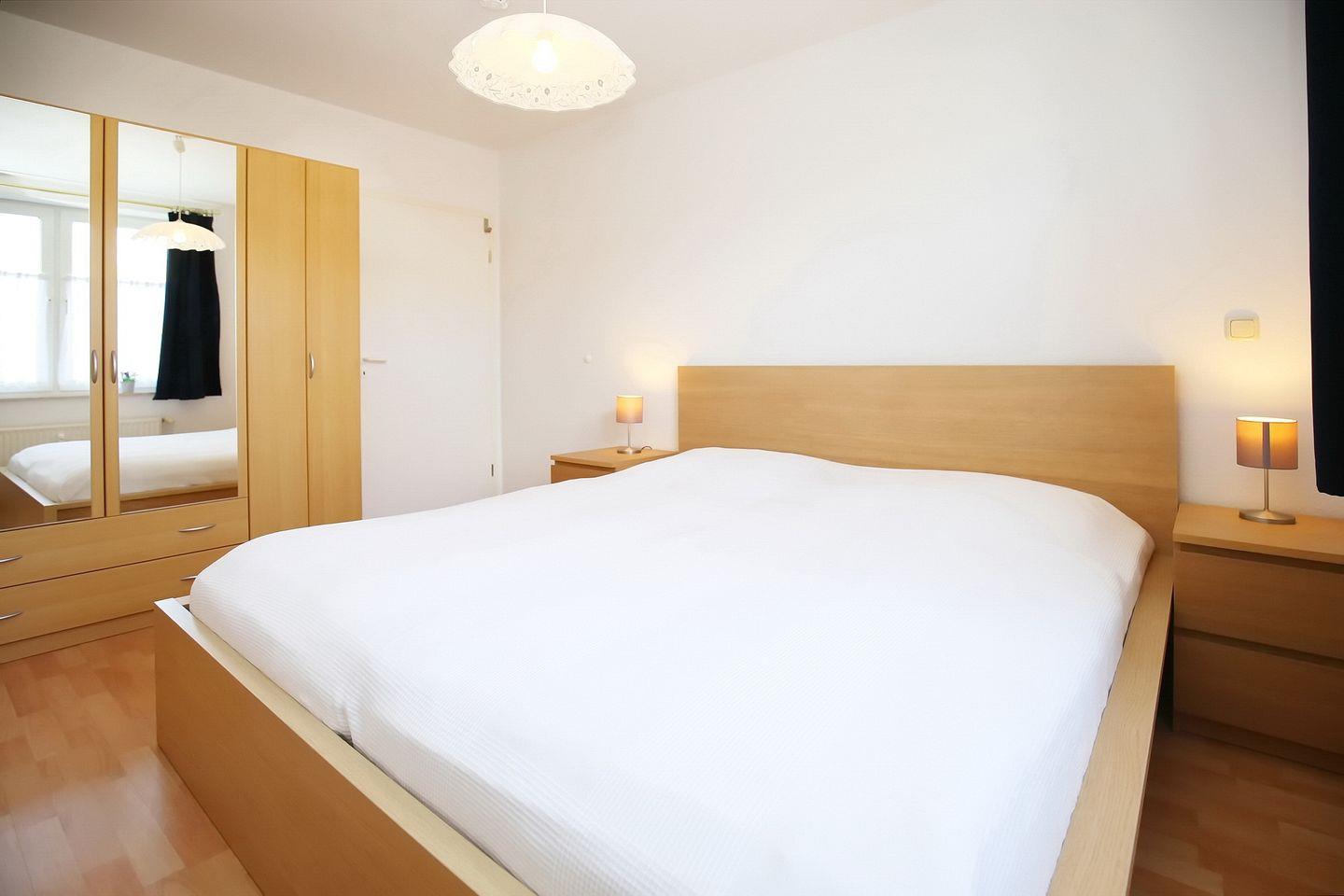 Die integrierte Küche bietet dir einen Kühlschrank mit Gefrierfach, einen Backofen, ein 4-Platten-Ceranfeld, eine Mikrowelle sowie einen Geschirrspüler. Das Schlafzimmer ist mit einem Doppelbett (2 x 90 x 200 cm) und einem 3-türigem Kleiderschrank eingerichtet. Das zweite Schlafzimmer verfügt über ein Etagenbett. Die Fenster haben Vorhänge. In beiden Schlafzimmern ist der Bodenbelag Laminat.