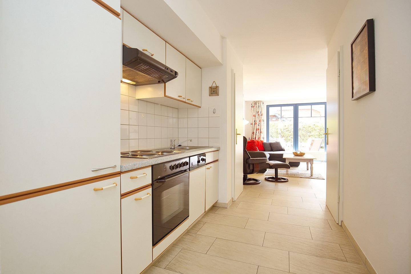 In der Küchenzeile findest du neben einer kompletten Geschirrauswahl auch einen Geschirrspüler, ein 4-Plattenkochfeld, einen Backofen und einen Kühlschrank mit Gefrierfach. Im Wohn- und Küchenbereich sind hochwertige Designerfliesen verlegt.