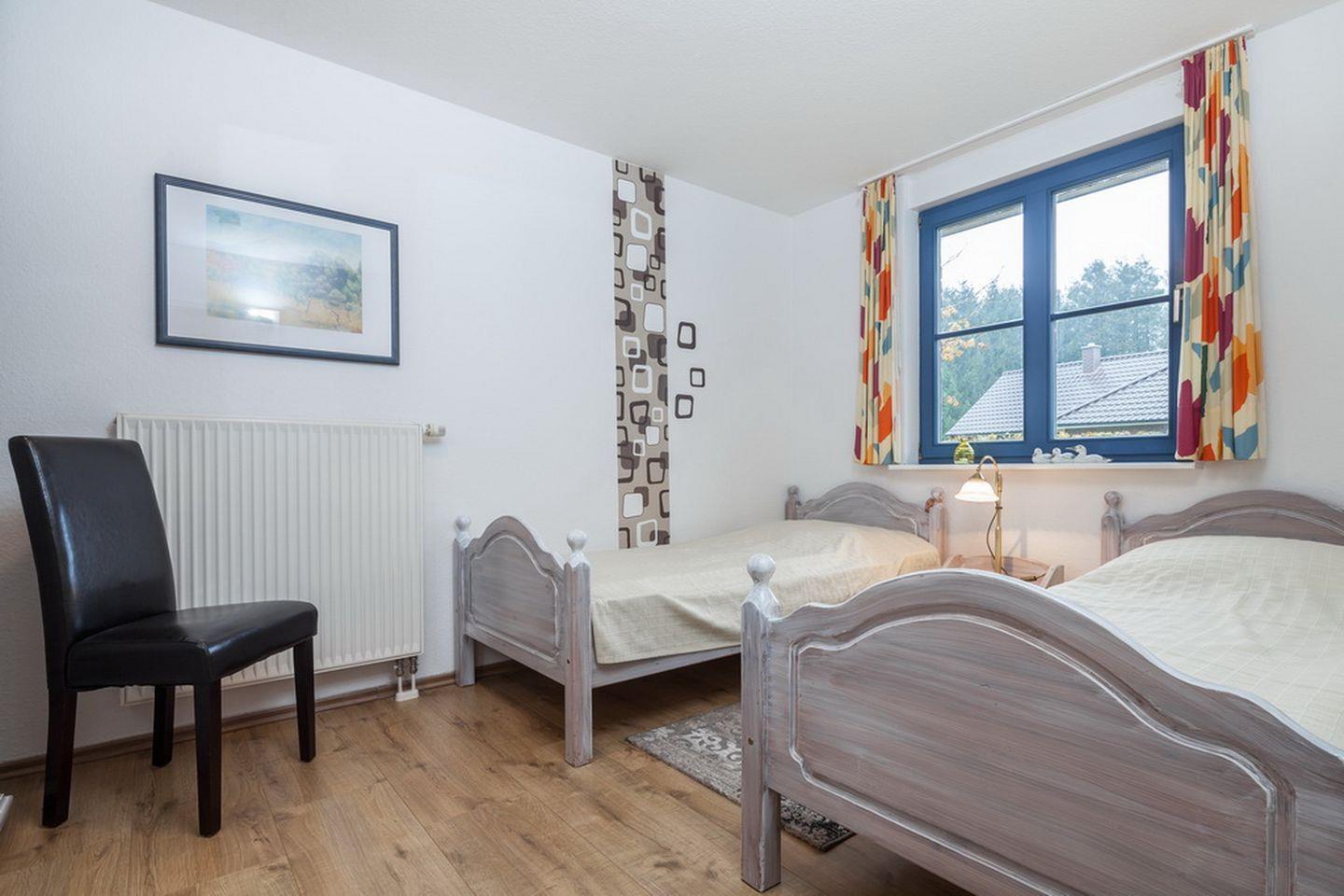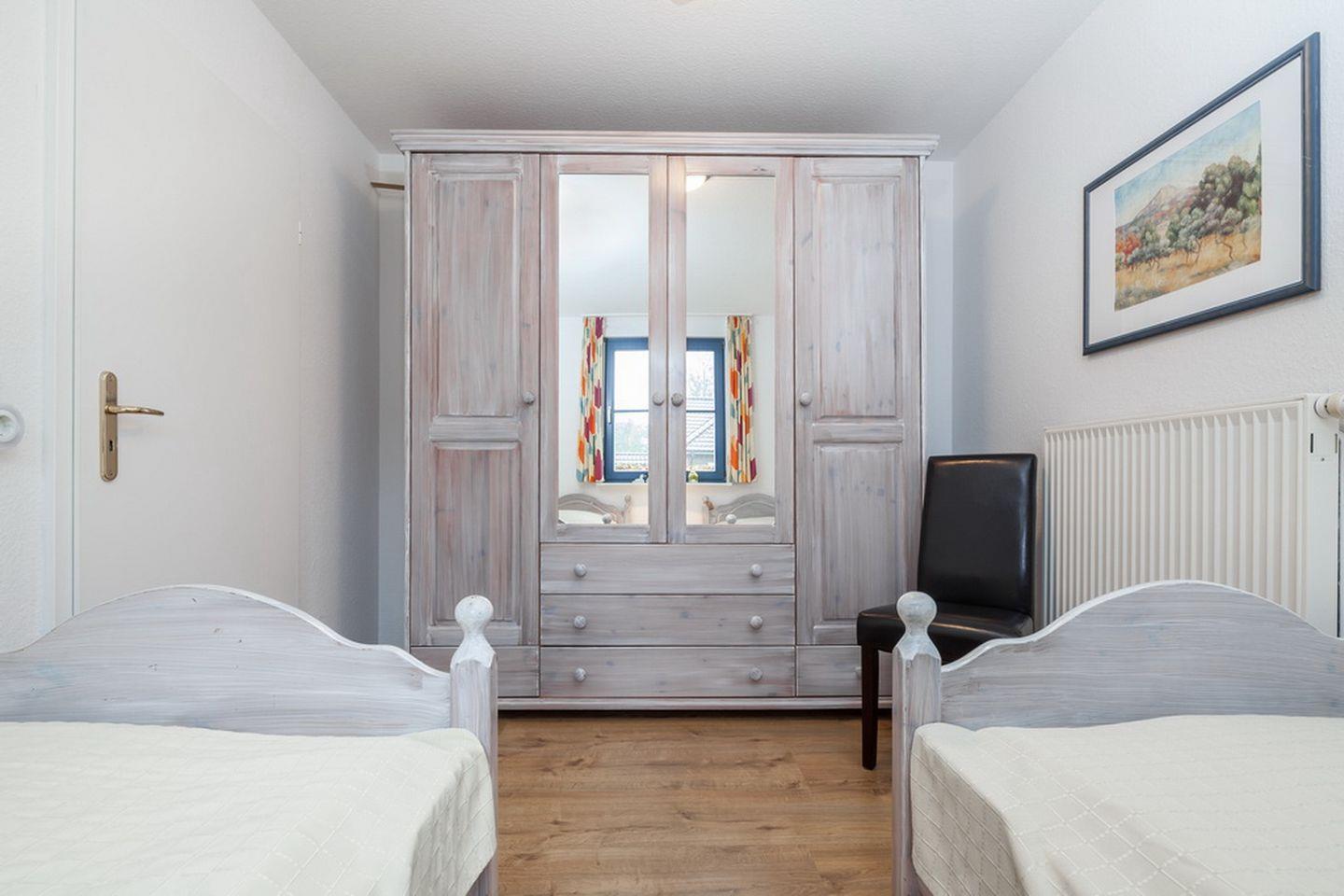 Das separate Schlafzimmer ist mit zwei Einzelbetten (90 x 200 cm) und einem geräumigen Kleiderschrank für deine Urlaubsgarderobe ausgestattet. Der Bodenbelag ist Laminat. Ein weiterer Garderobenschrank befindet sich auf dem Flur. An allen Fenstern der Wohnung sind Außenjalousien zur Abdunkelung angebracht.