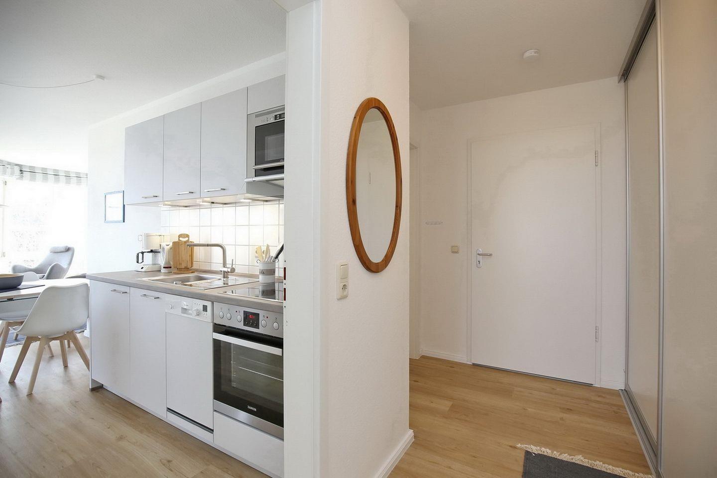Zur Ausstattung der Küchenzeile gehören ein 4-Platten-Cerankochfeld, ein Backofen, ein Kühlschrank mit Gefrierfach, ein Geschirrspüler und eine Mikrowelle.
