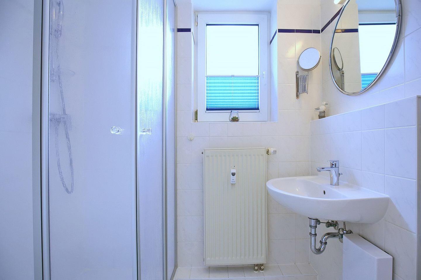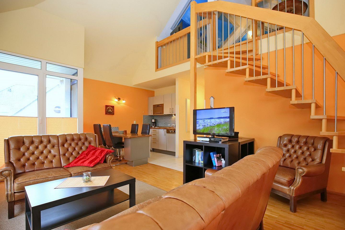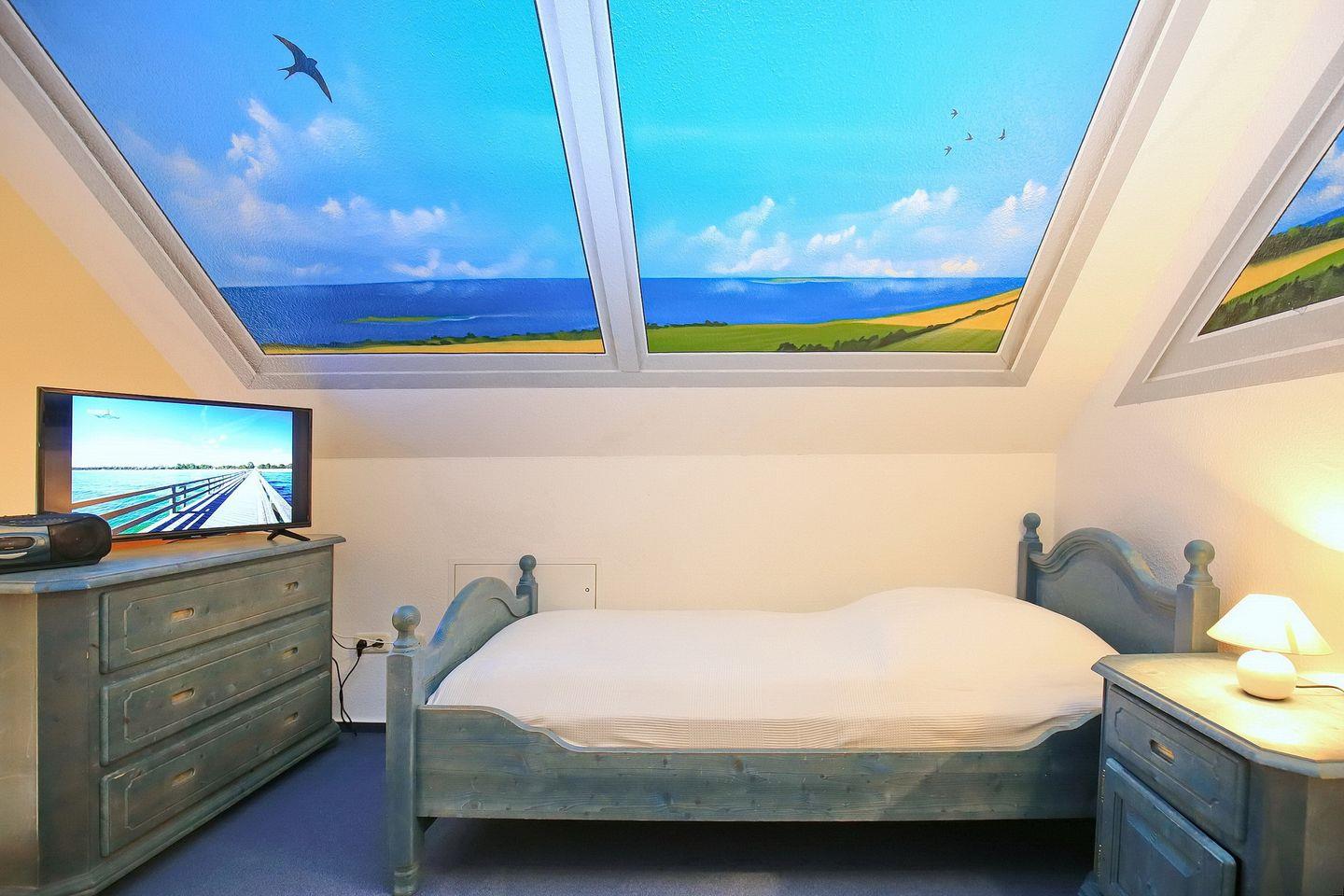 Eine Treppe führt vom Wohnraum aus in die offene, im maritimen Stil gestaltete Schlafgalerie mit zwei Einzelbetten (90 x 180 cm) und einem zweiten Flatscreen-TV. Die Fenster im Spitzboden sind nur als Dekobilder vorhanden. Des Weiteren verfügt die Ferienwohnung über ein Schlafzimmer mit Doppelbett (2 x 90 x 200 cm). Auch ein Tageslichtbadezimmer ist vorhanden. Als Sichtschutz dienen hier Plissees, ein Rollo sowie Vorhänge. Die Böden sind mit Parkett, Teppich und auch Fliesen ausgelegt.