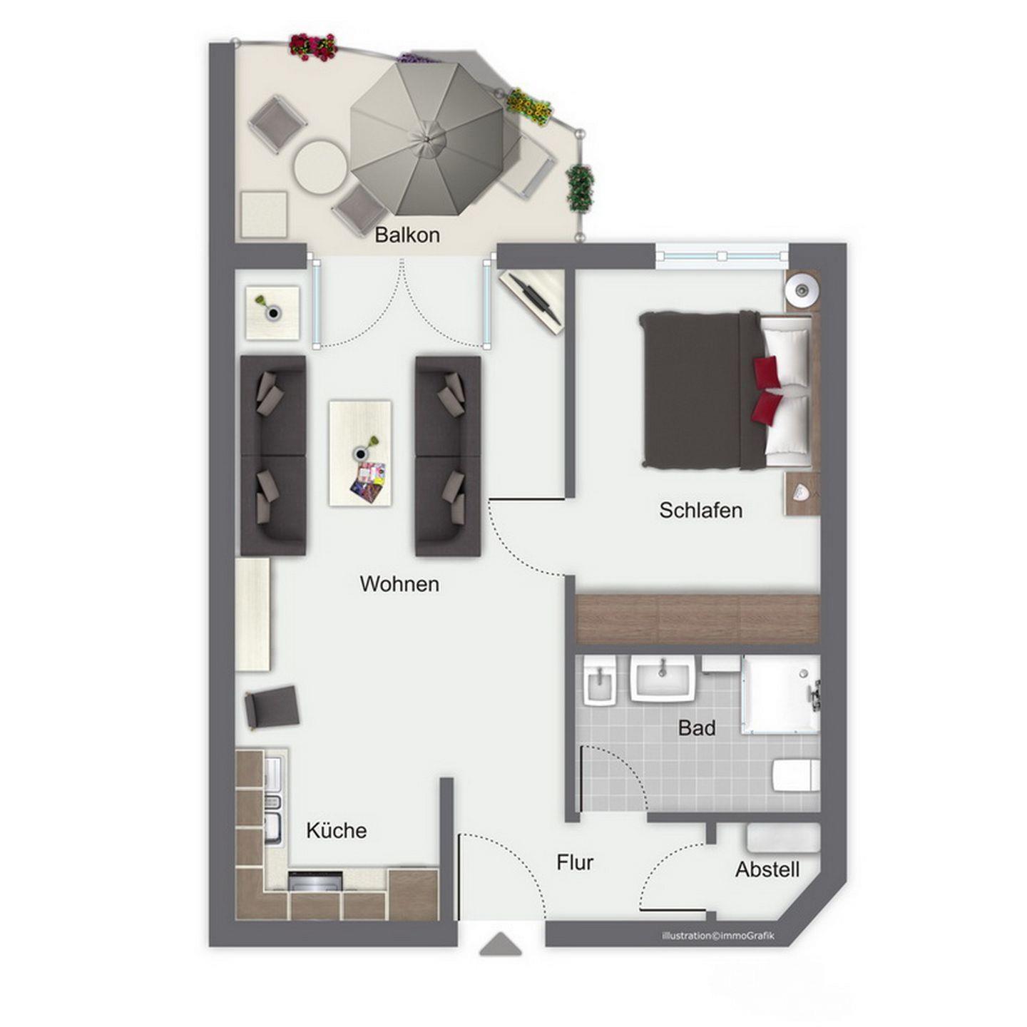 Auf ca. 42 m² verfügt die Wohnung 12 über ein Wohnzimmer mit Küchenzeile, ein Schlafzimmer, ein Duschbad sowie einen West-Balkon. Die Entfernung zum Strand beträgt ca. 60 Meter.