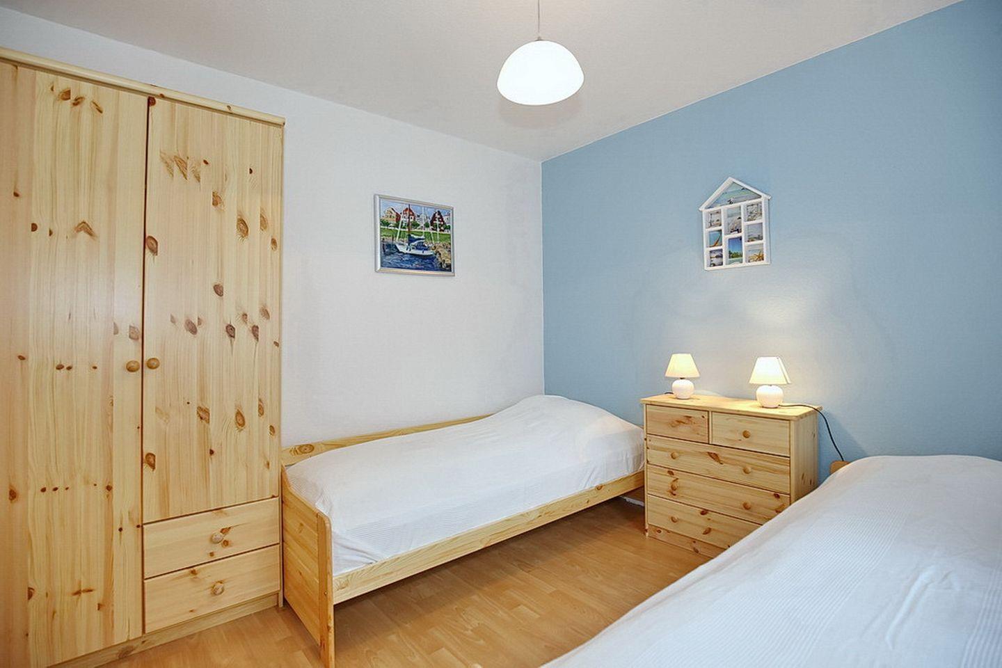Im Schlafzimmer im Erdgeschoss stehen zwei Einzelbetten (90 x 200 cm) und ein Kleiderschrank. Das Schlafzimmer im 1. Obergeschoss hat ein Doppelbett (2x 90x 200 cm), einen Kleiderschrank und einen 2. TV. Von diesem Schlafzimmer aus erreichst du das Gäste-WC, das zusätzlich Platz für einen Wäschetrockner bietet. Die Fenster der Schlafzimmer lassen sich entweder mit Außenjalousien oder einem Rollo verdunkeln.