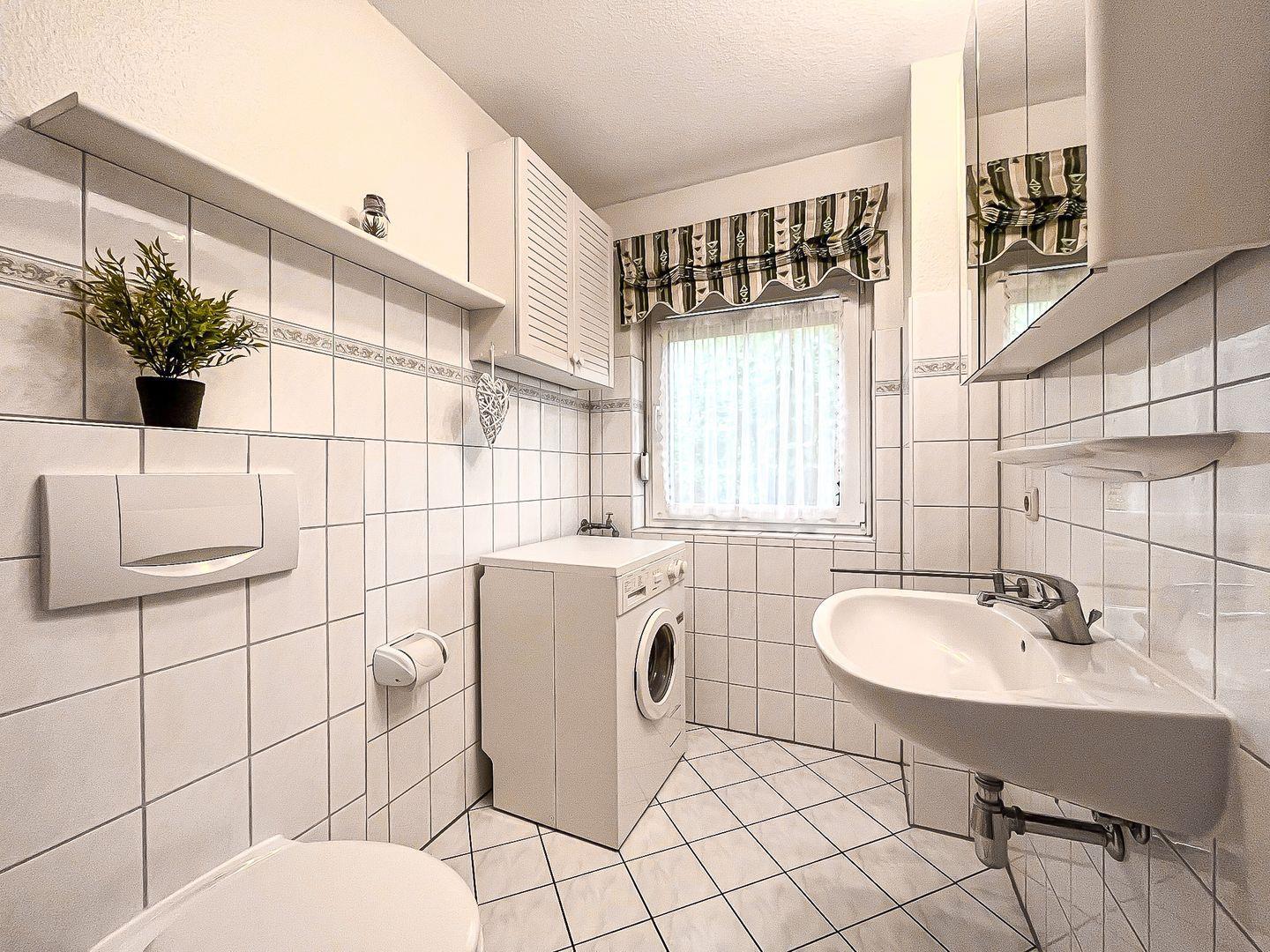 Im Duschbad mit Fenster findest du neben der Dusche auch eine Waschmaschine, die du kostenfrei nutzen darfst. Alle Fußböden in diesem Ferienhaus sind mit Laminat oder Fliesen versehen.