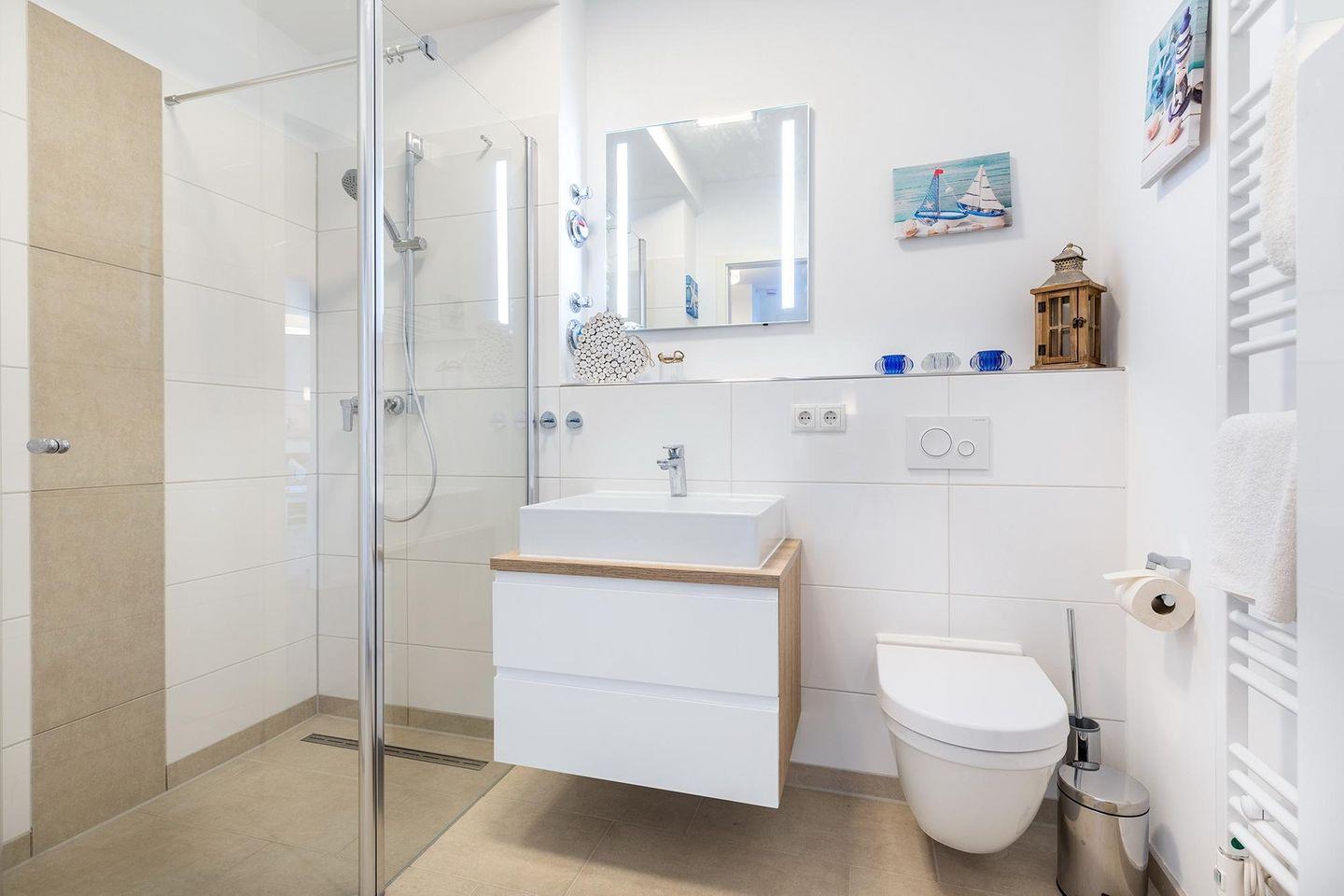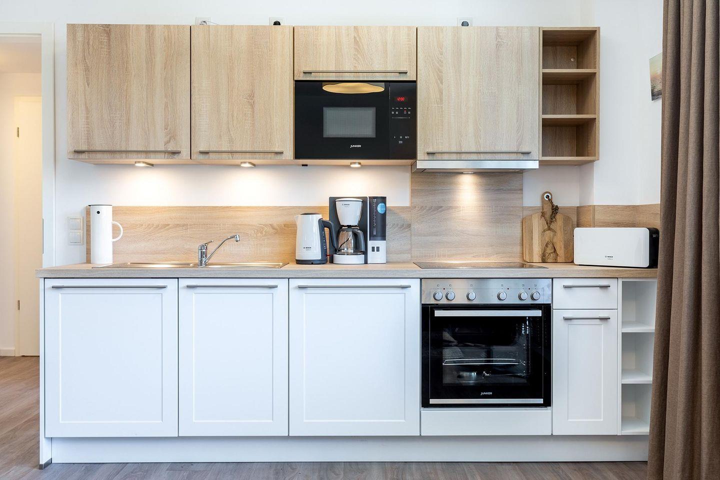 Das familienfreundliche und moderne Nichtraucher-Apartment verfügt über Fußbodenheizung, bodentiefe Fenster mit 3-fach Isolierung, kostenfreies WLAN und eine voll ausgestattete offene Küche mit Geschirrspüler, Gefrierfach, Kaffeemaschine, Toaster, Wasserkocher, Backofen und Mikrowelle sowie über einen Essbereich. Im Wohnbereich befindet sich eine Doppelschlafcouch (1,60 x 2,00 m) und ein großer Flatscreen-TV mit Blu-ray-Player. Das separate Schlafzimmer ist mit einem modernen Boxspringbett (1,80 x 2,00 m) und einem Flatscreen-TV ausgestattet. Ein Kinderbett kann gegen Entgelt aufgestellt werden und auf Wunsch könnt ihr einen Kinderhochstuhl hinzubuchen. Im stilvollen Badezimmer befinden sich eine ebenerdige Dusche, ein Waschtisch mit Föhn, Kosmetikspiegel und Handtuchheizkörper. Das Apartment verfügt über einen Flur mit Garderobe. Nach einem erholsamen Urlaubstag lässt es sich auf der mit Gartenmöbeln und Sonnenschirm ausgestatteten und sonnigen Terrasse, herrlich entspannen. Die Terrasse ist vom Wohnzimmer aus begehbar.