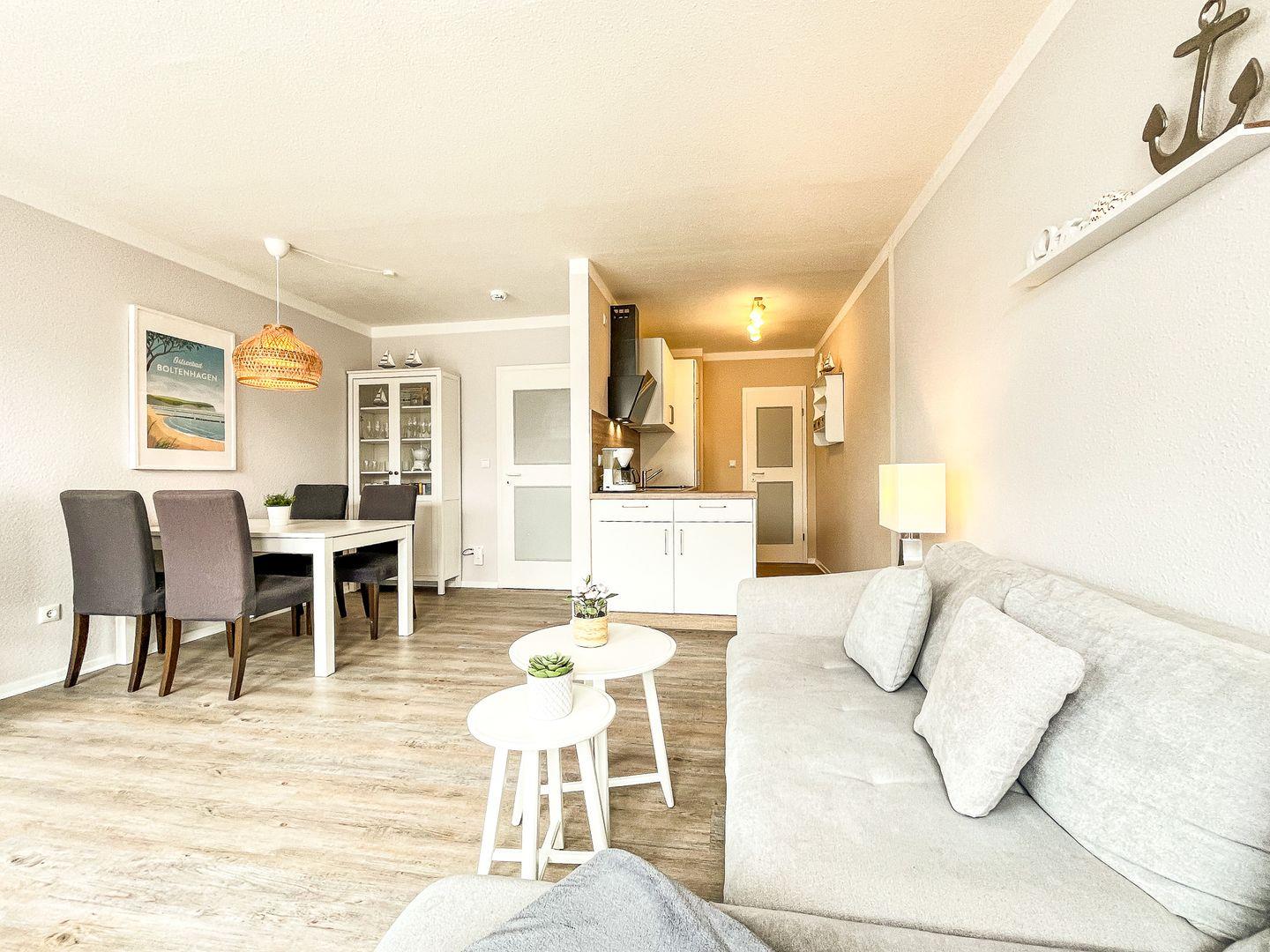 Über den Wohn- und Essbereich gelangst du auf den möblierten Balkon. Neben einer Couch gibt es im Wohnzimmer auch einen hellen Essbereich für vier Personen. Ein Flachbild-TV, eine Stereoanlage und ein CD-Player sorgen für deine Unterhaltung.