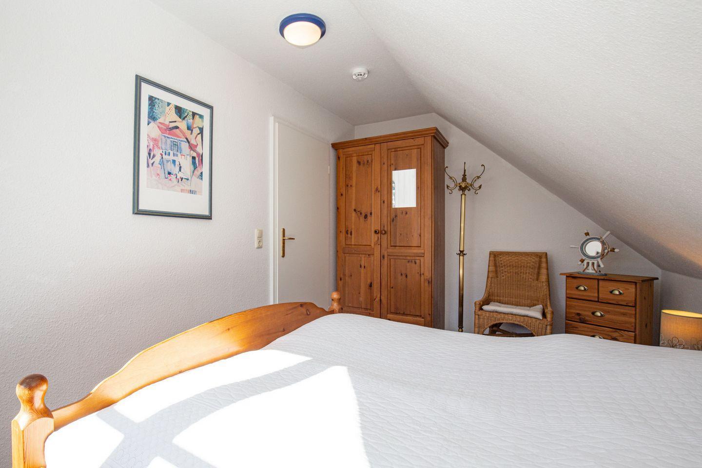 Im Schlafzimmer im 1. OG findest du neben zwei Einzelbetten (2 x 90 x 200 cm) auch einen Kleiderschrank. Ein Verdunklungsrollo sorgt für erholsamen Schlaf. In den beiden Schlafzimmern im Obergeschoss befinden sich jeweils ein Doppelbett (2 x 90 x 200 cm und 2 x 80 x 200 cm) und ein Kleiderschrank. Die Fenster werden durch Vorhänge verdunkelt.