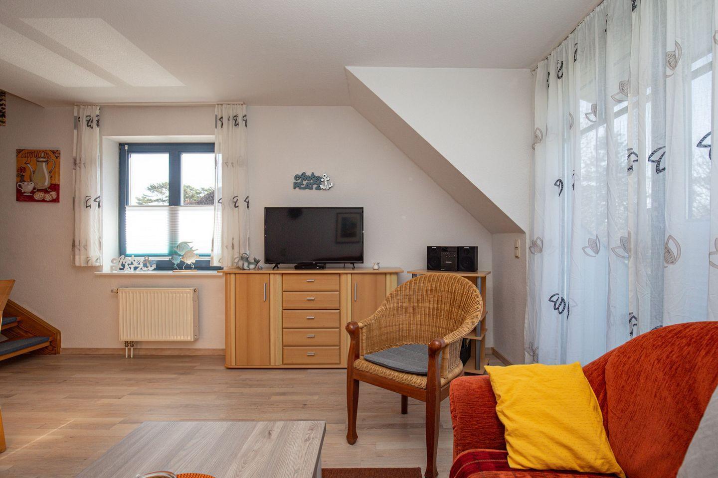 Den möblierten Balkon erreichst du direkt vom Wohnbereich. Im Wohnraum befinden sich die bequeme Sitzgruppe und der großzügige Essbereich für sechs Personen. Für deine Unterhaltung sorgen ein Flachbild-TV, eine Stereoanlage und eine Auswahl an Spielen und Büchern. Über eine innenliegende Treppe erreichst du die beiden Schlafzimmer im Dachgeschoss. Im Wohnbereich ist Laminat ausgelegt und in den Schlafzimmern befinden sich Teppichböden.