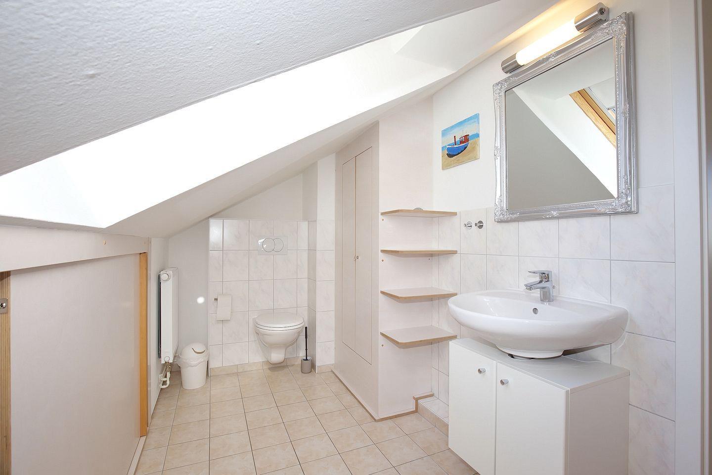 Eine Holztreppe führt in die ebenfalls helle, freundliche obere Etage des Ferienhauses. Das geräumige zweite Schlafzimmer mit breitem Doppelbett (180 x 200 cm) ist mit Vollholzmöbeln ausgestattet. Ein Kleinkinder-Bett sowie ein Kinderhochstuhl sind vorhanden. Hier verfügst du über ein Gäste-WC mit Waschbecken.