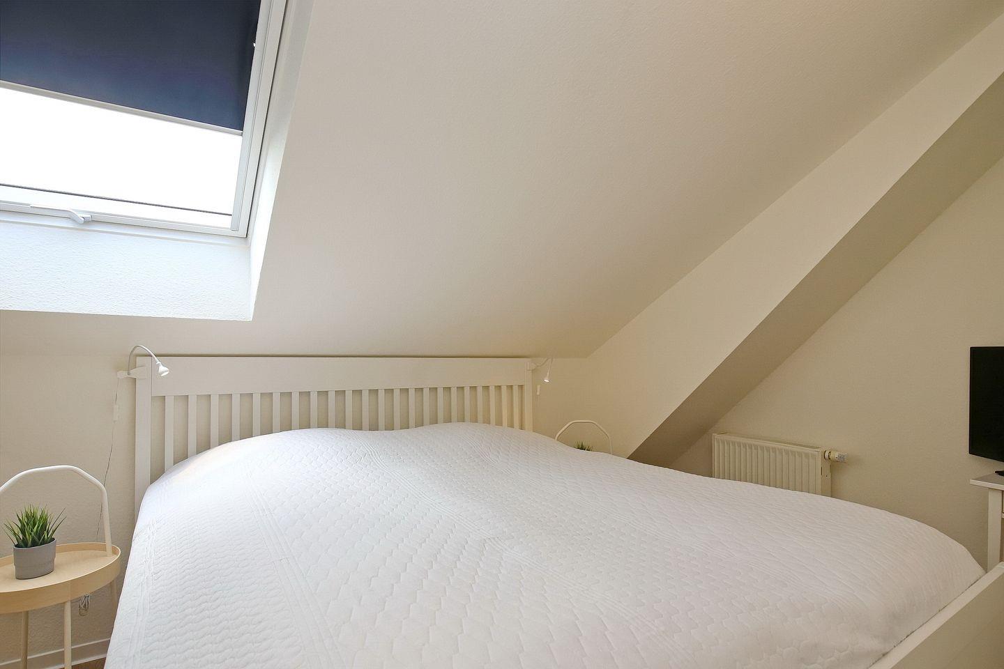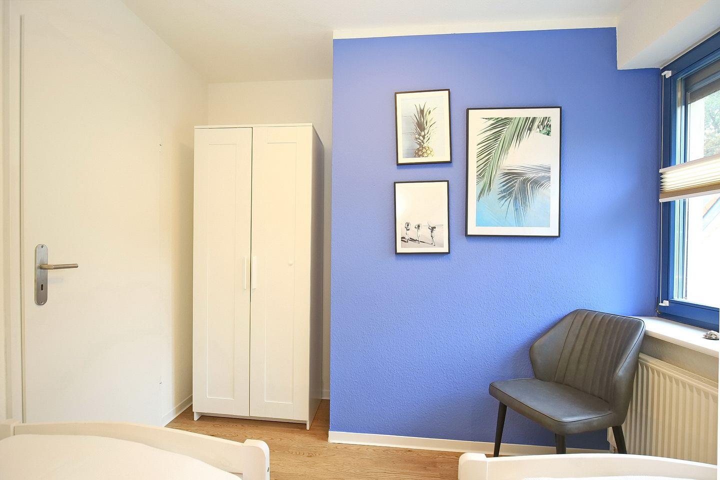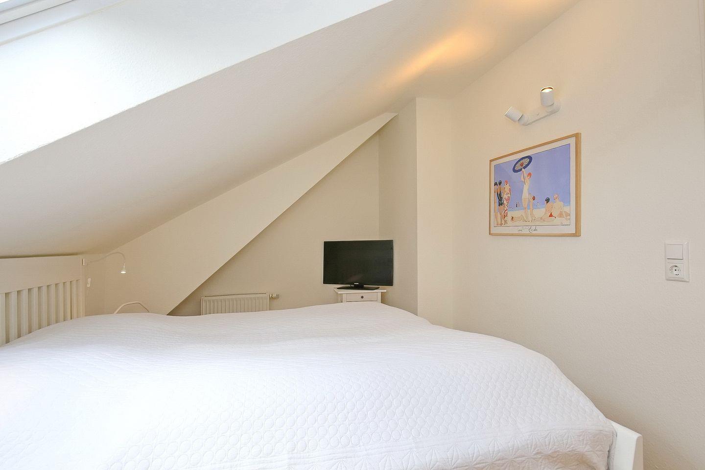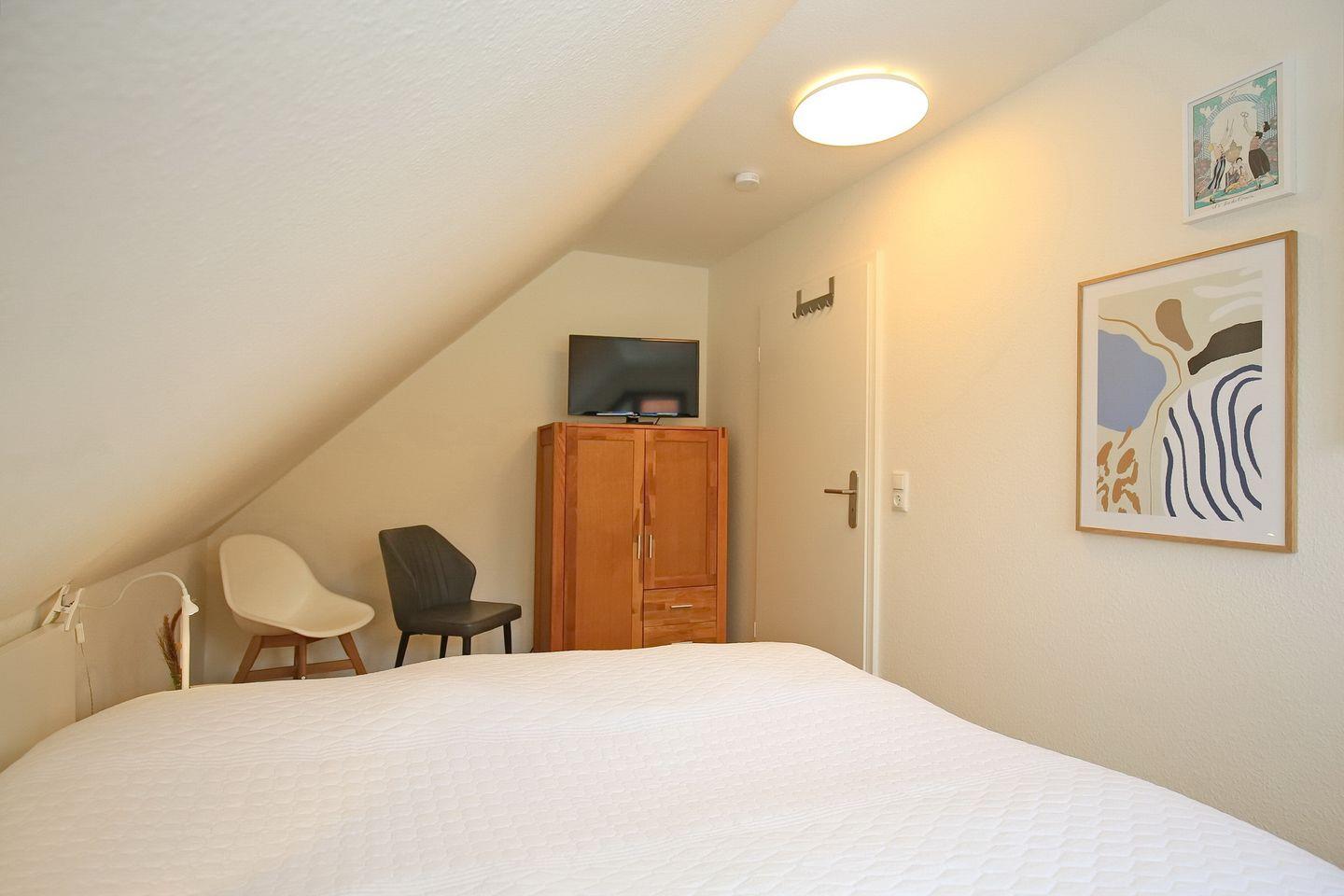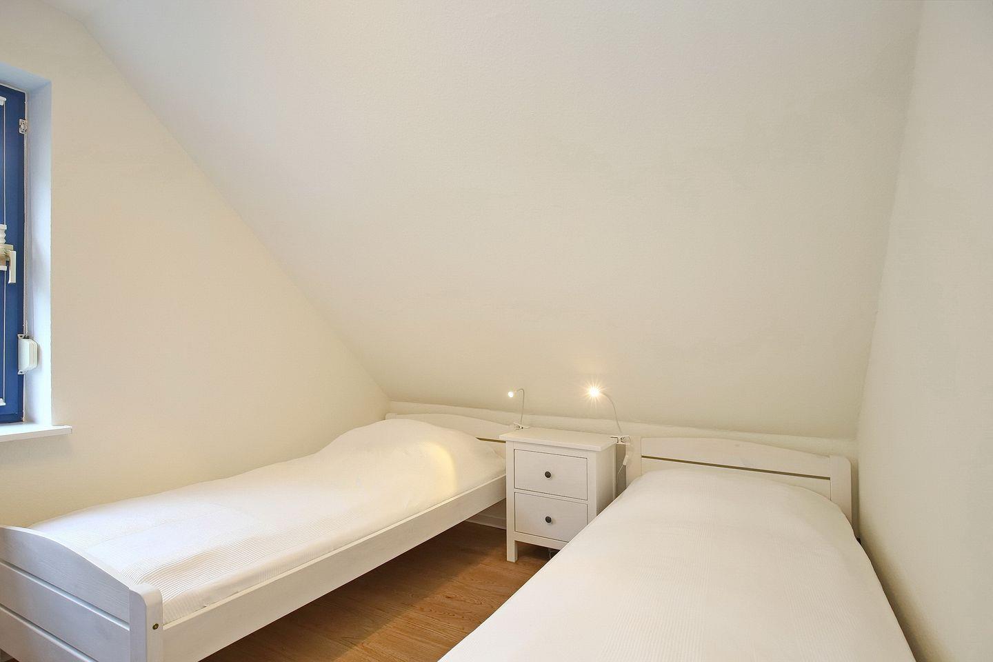 Das Schlafzimmer im unteren Bereich ist mit zwei Einzelbetten (2 x 90 x 200 cm) und einem Kleiderschrank für die Urlaubsgarderobe möbliert. Im Obergeschoss befinden sich zwei weitere Schlafzimmer, jedes dieser Schlafzimmer ist mit einem Doppelbett (2 x 90x 200 cm) ausgestattet. Du findest in den oberen beiden Schlafzimmern einen Flachbild- TV sowie einen Kleiderschrank vor. Im Flur befindet sich eine Kommode. Zur Verdunkelung gibt es Plissees und Rollos an den Fenstern.