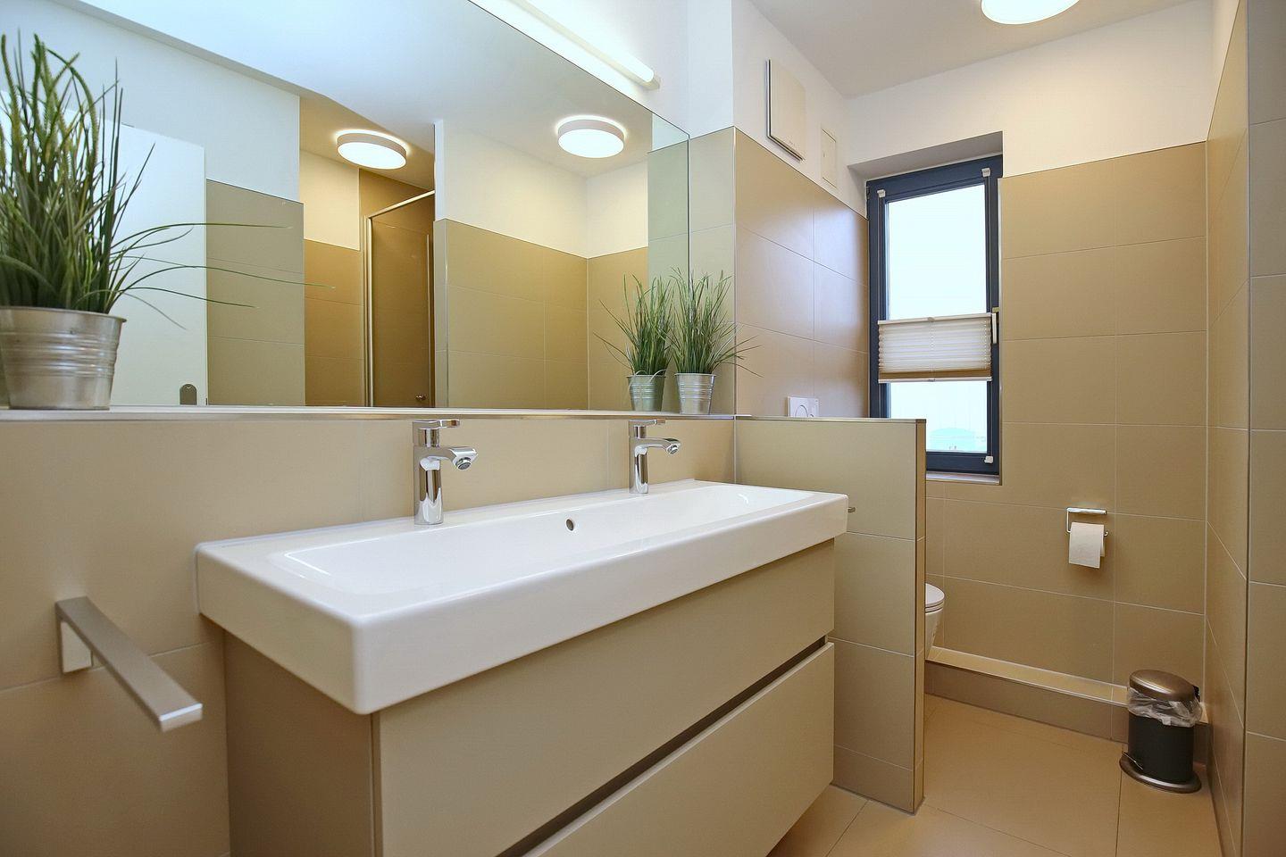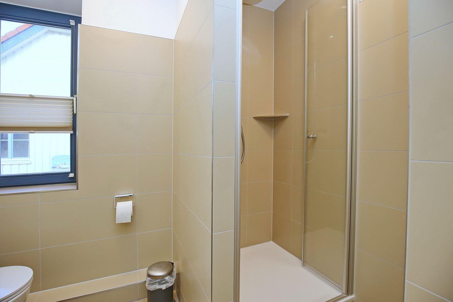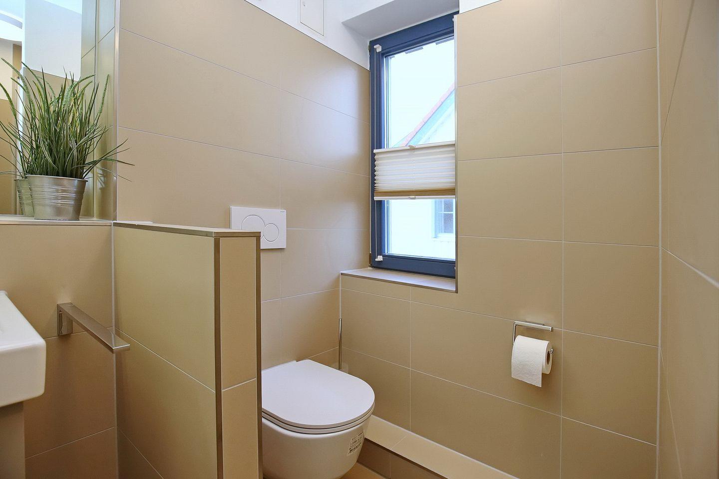Ein funktionelles Duschbad mit WC und Fenster sowie ein Gäste-WC gehören ebenfalls zur Wohnung. Hier sind Fliesen verlegt. Der Bodenbelag in den Wohn- und Schlafbereichen ist Designbelag. Für kleine Gäste sind ein Kinderbett und ein Hochstuhl vorhanden. Fahrräder können im Fahrradständer am Haus abgestellt werden.