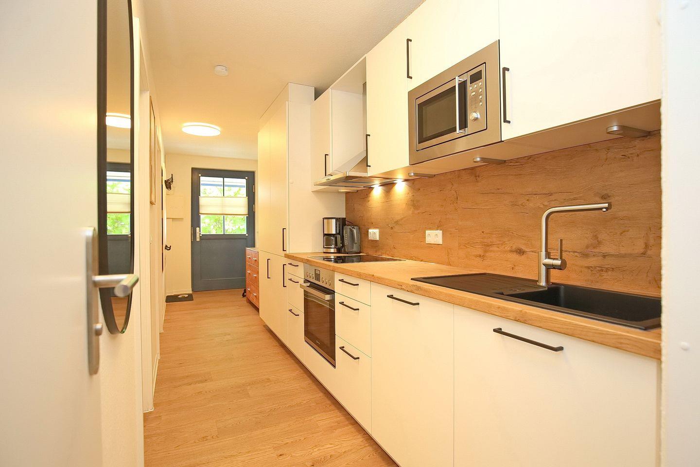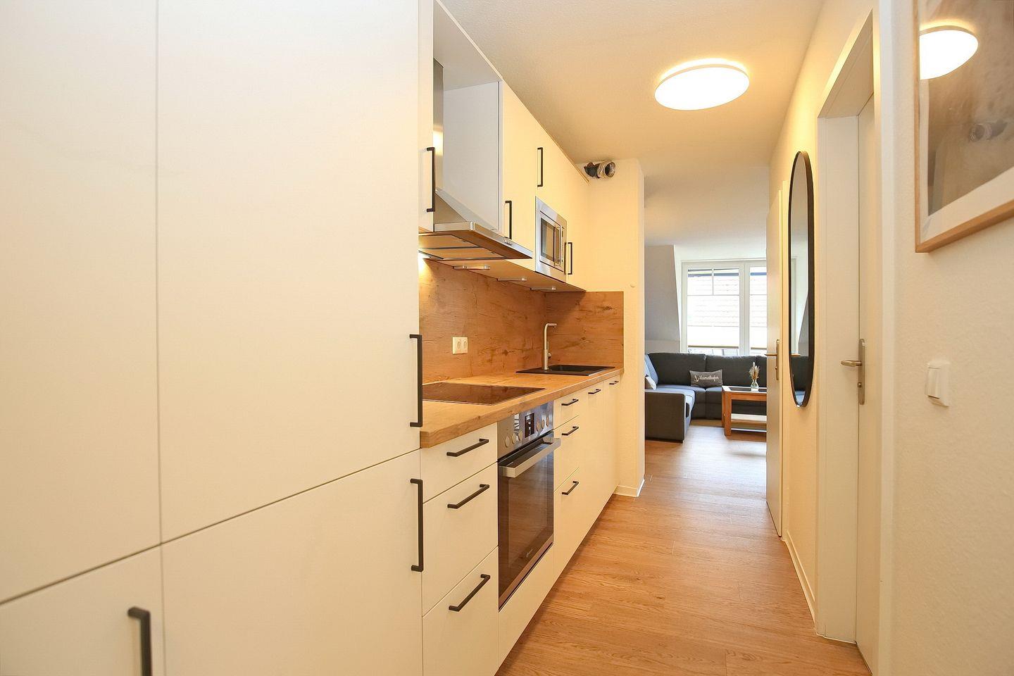 In unmittelbarer Nähe zur Essecke befindet sich die Küchenzeile mit Geschirrspüler, Kühlschrank mit Gefrierfach und 4-Platten-Cerankochfeld mit Backofen. In dieser Nichtraucherwohnung sind Haustiere nicht erlaubt.