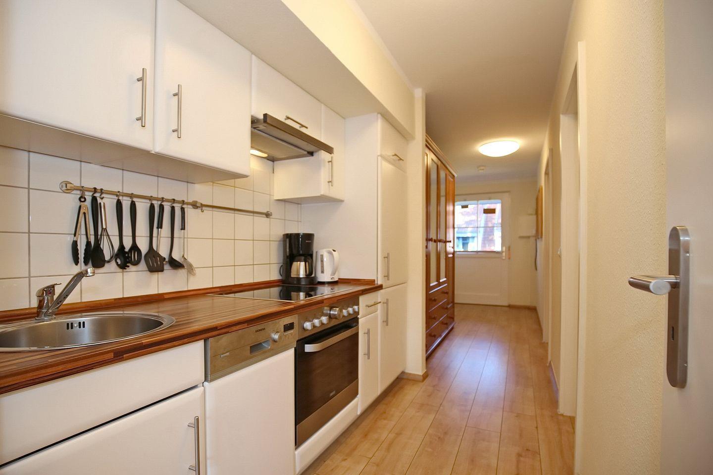 Die integrierte Küchenzeile ist mit einem 4-Plattenkochfeld mit Backofen, einem Geschirrspüler und einem Kühlschrank mit Gefrierfach ausgestattet. Im gemütlich eingerichteten Schlafzimmer im Untergeschoss erwarten dich zwei Einzelbetten (80 x 200 cm) und ein Kleiderschrank. Ein zusätzlicher Kleiderschrank im Flur schafft Stauraum für Mitgebrachtes. In der gesamten Wohnung wurde der Boden mit Laminat ausgelegt.
