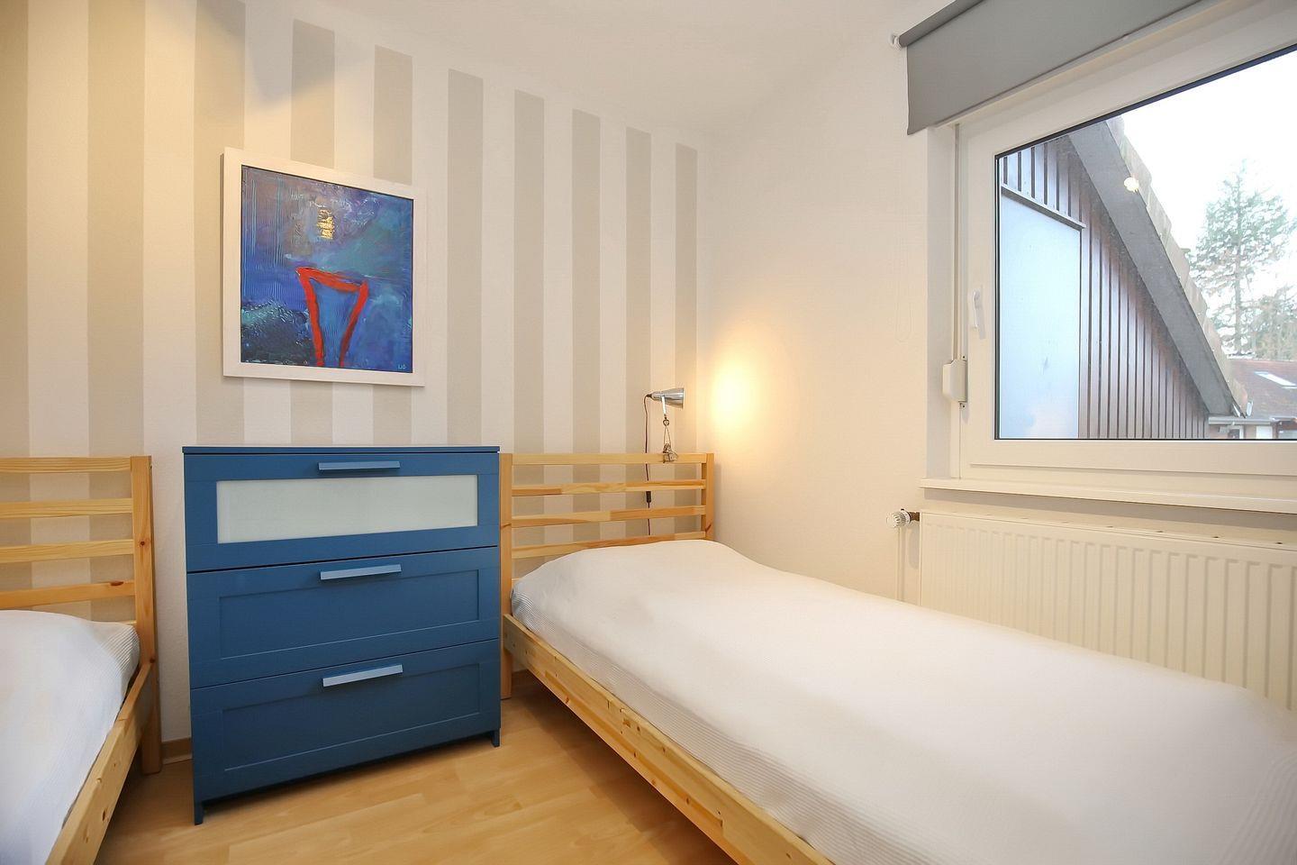 Der Schlafraum im Erdgeschoss verfügt über zwei Einzelbetten (je 90 x 200 cm) und einer Kommode.