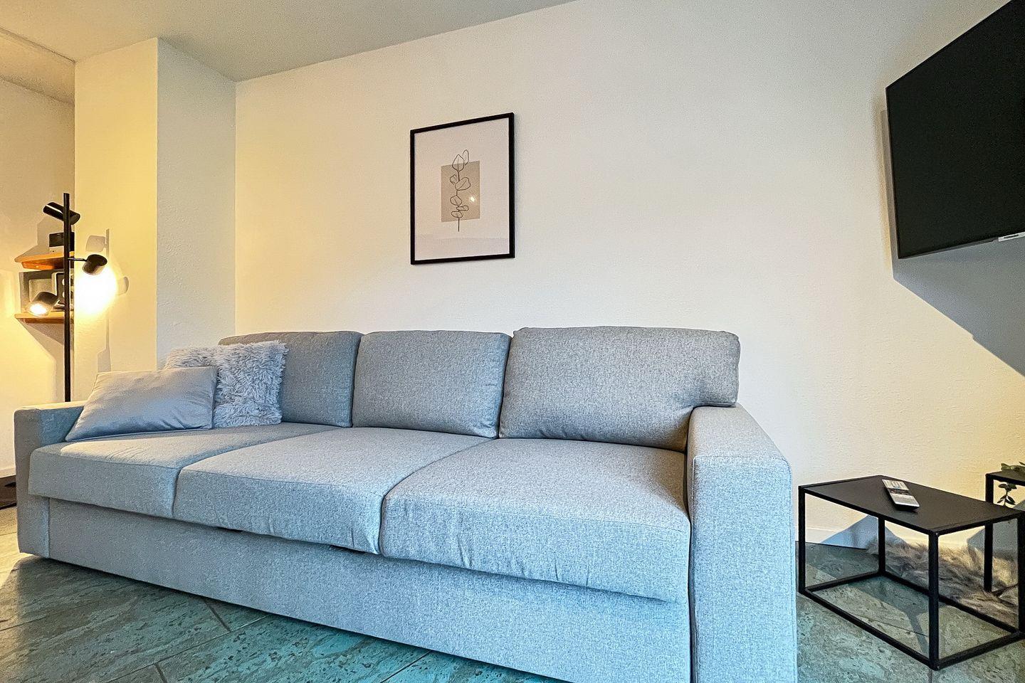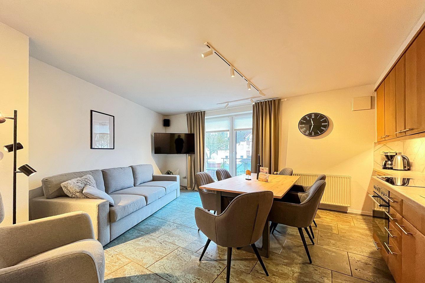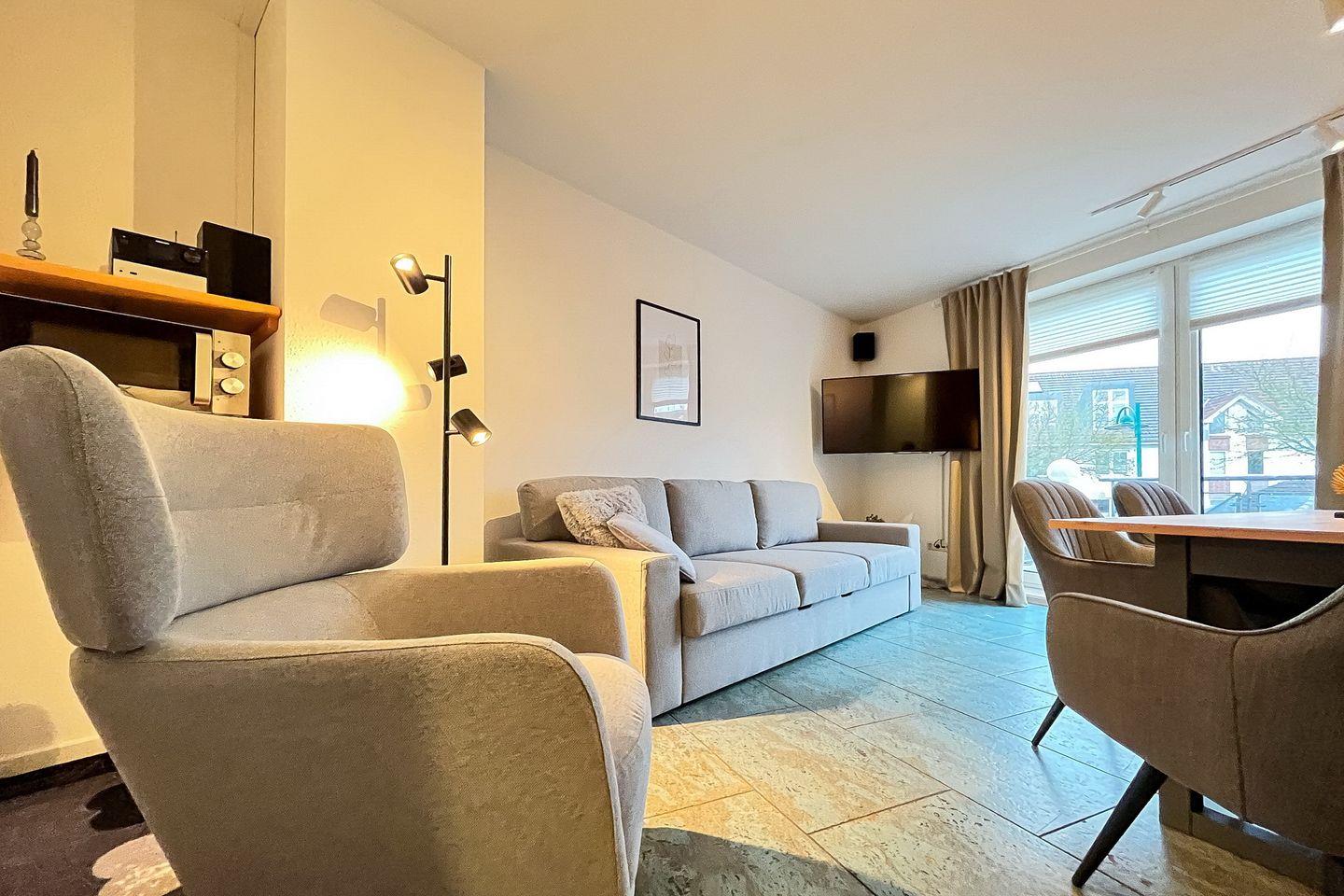 Über den Wohnbereich gelangst du auf den möblierten Balkon. Das Wohnzimmer schafft mit einem bequemen Schlafsofa (140 x 200 cm) und einem Esstisch für 6 Personen ein stilvolles Ambiente. Zum Zeitvertreib dienen ein Flachbild-TV und ein Radio.