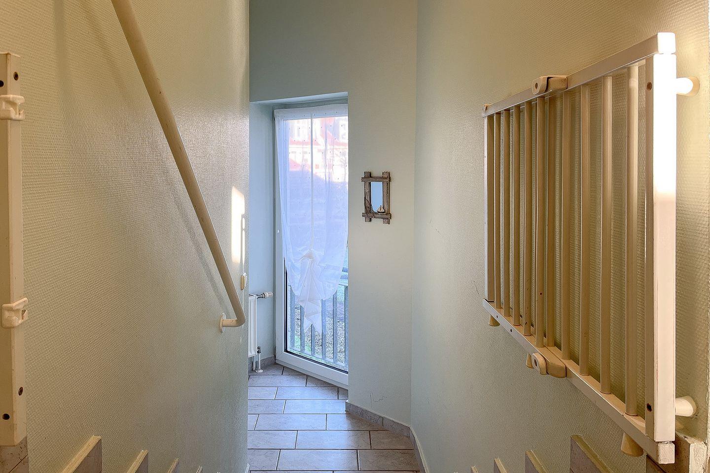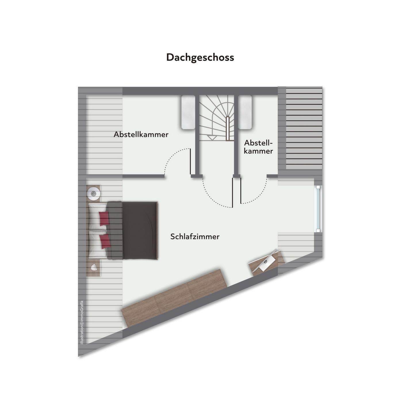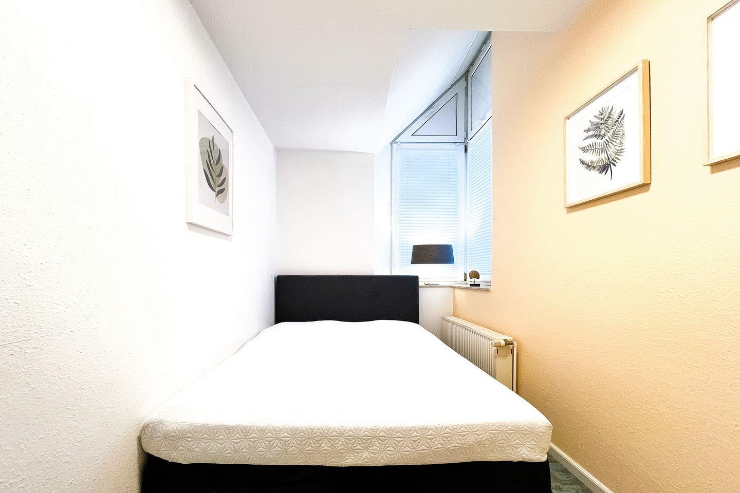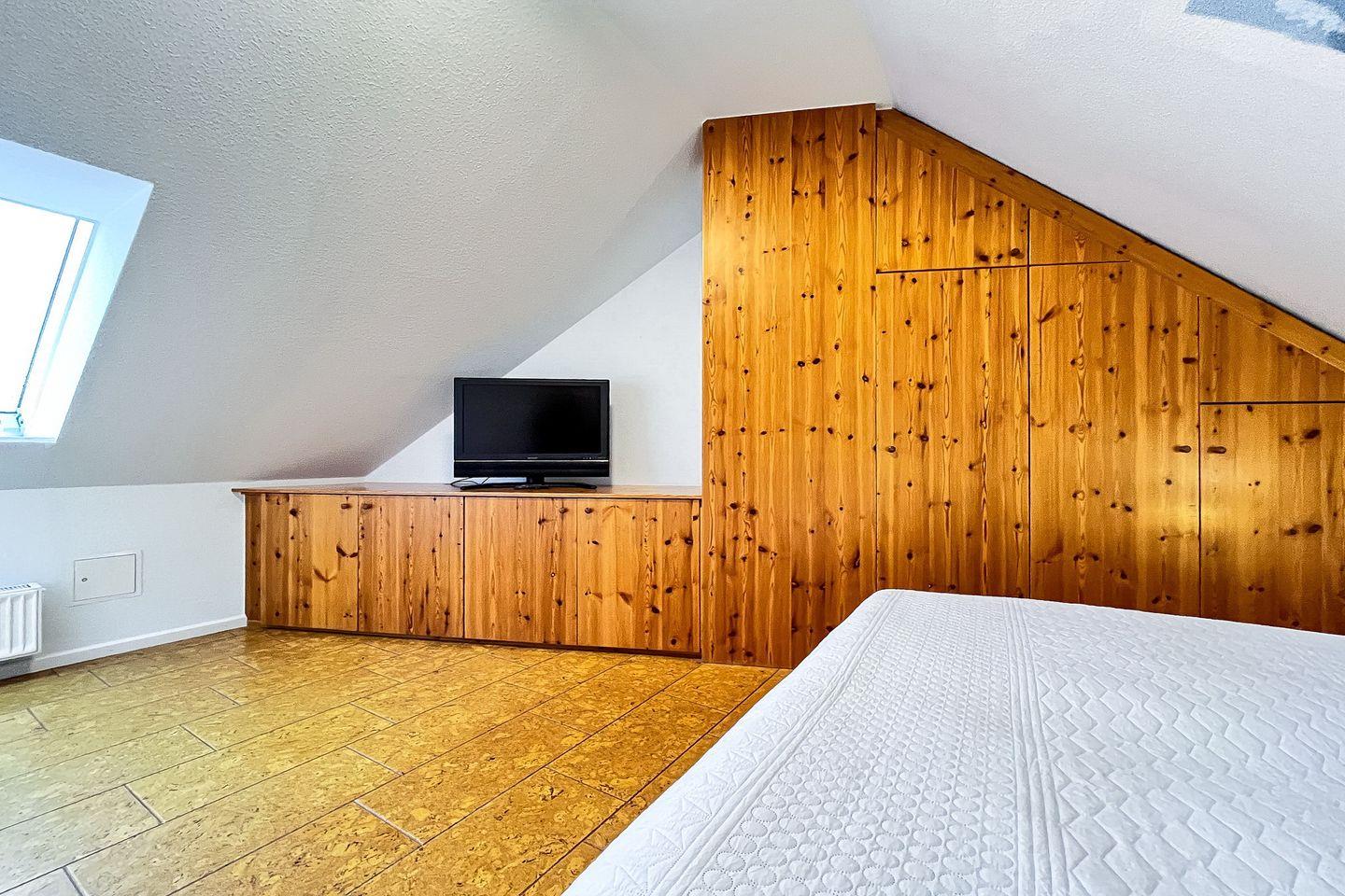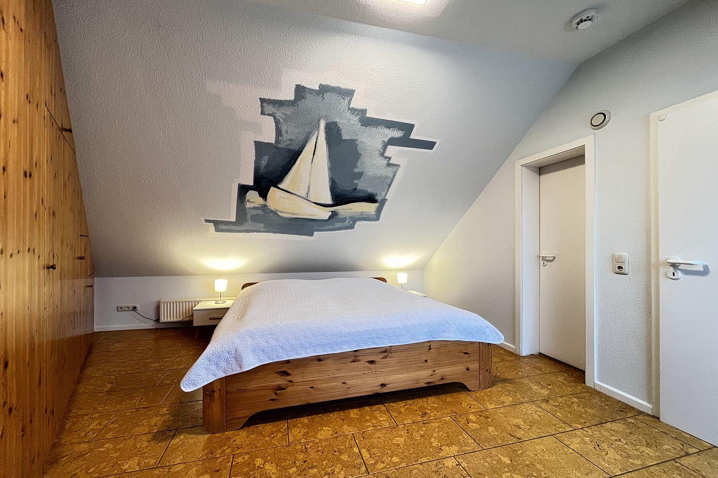Im ersten Schlafzimmer steht ein Boxspringbett (140 x 200 cm) und ein Kleiderschrank. Das Schlafzimmer im Dachgeschoss ist mit einem Doppelbett (180 x 200 cm) und einem Kleiderschrank ausgestattet. Die Fenster werden mit einem Rollo verdunkelt.