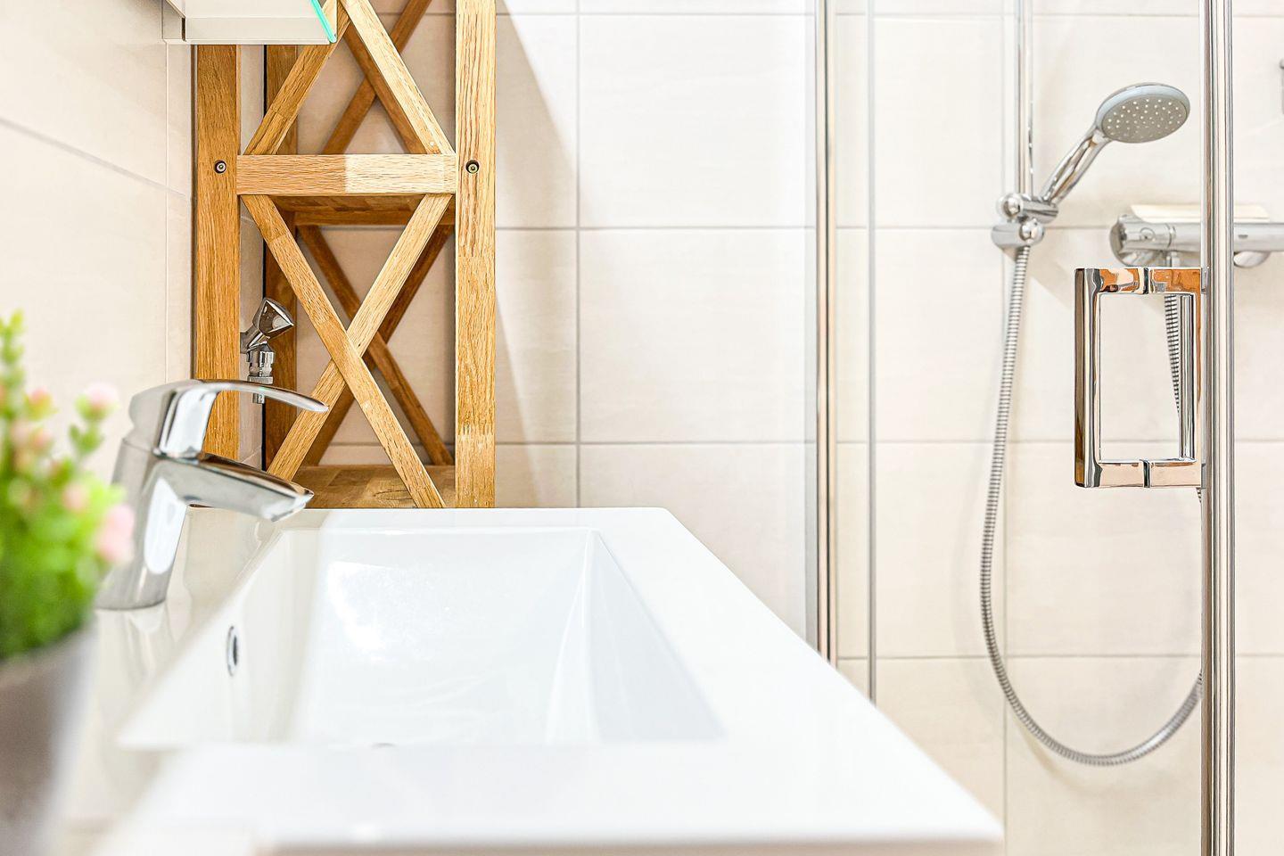 Das neue Duschbad ist gefliest und bietet diverse Möglichkeiten zur Ablage oder zum Aufhängen von Handtüchern. Ein Föhn ist vorhanden.