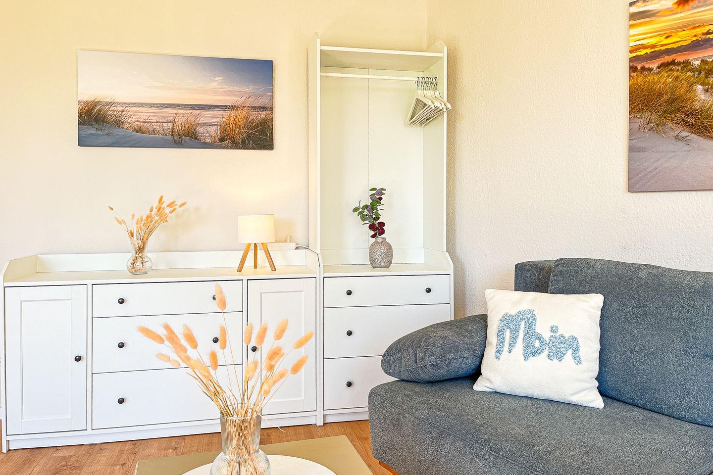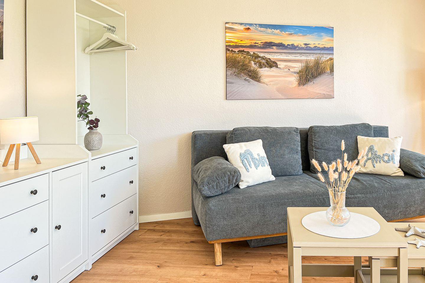 Du bewohnst im Erdgeschoss ein komfortables 2-Zi. Apartment mit Terrasse in Süd-Lage. Es erwartet dich ein Wohn-/ Essbereich, ein Schlafzimmer, eine Küchenzeile sowie ein Duschbad. Die Strandentfernung beträgt von der Anlage Sünnslag ca. 400 m.