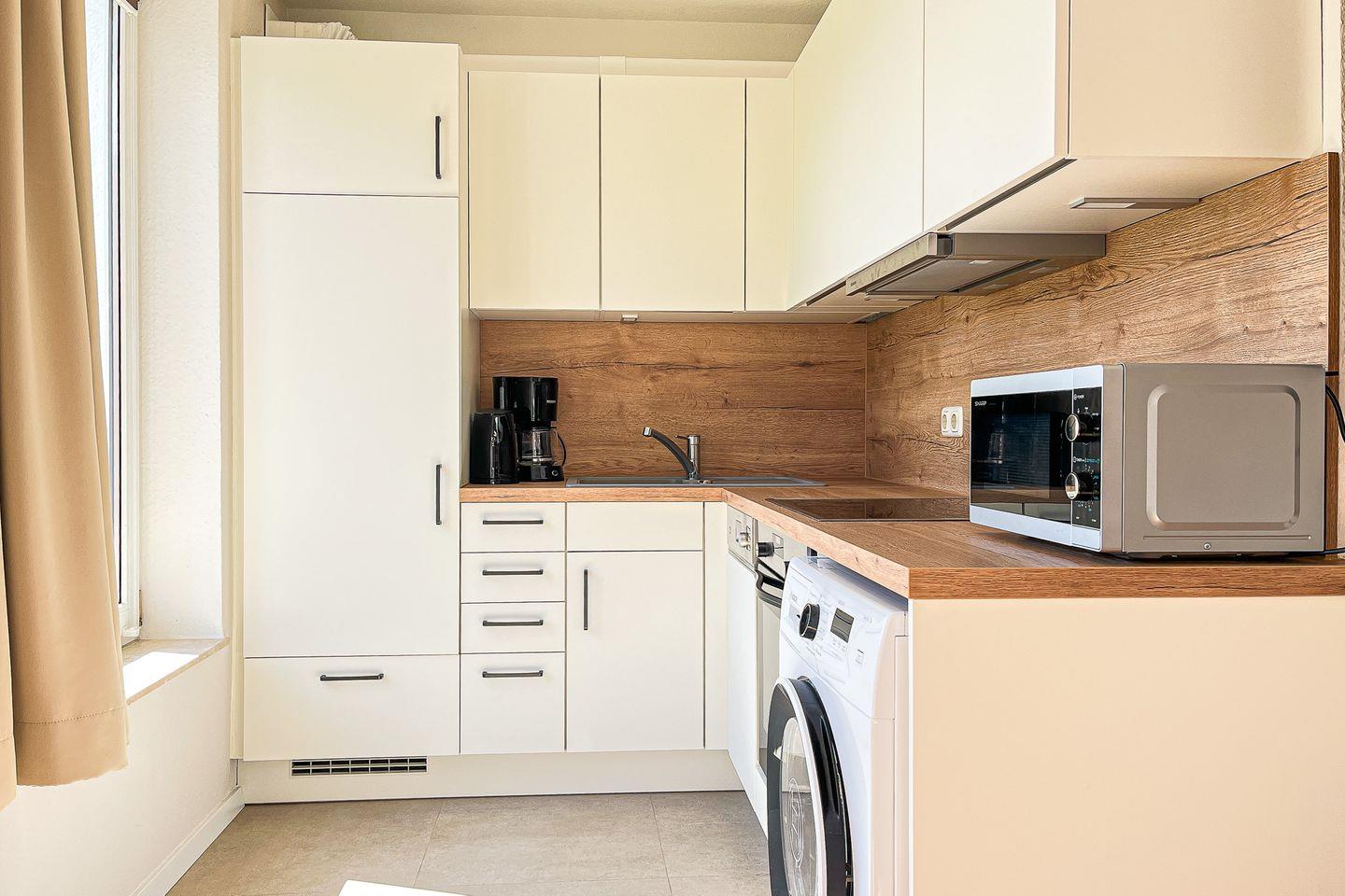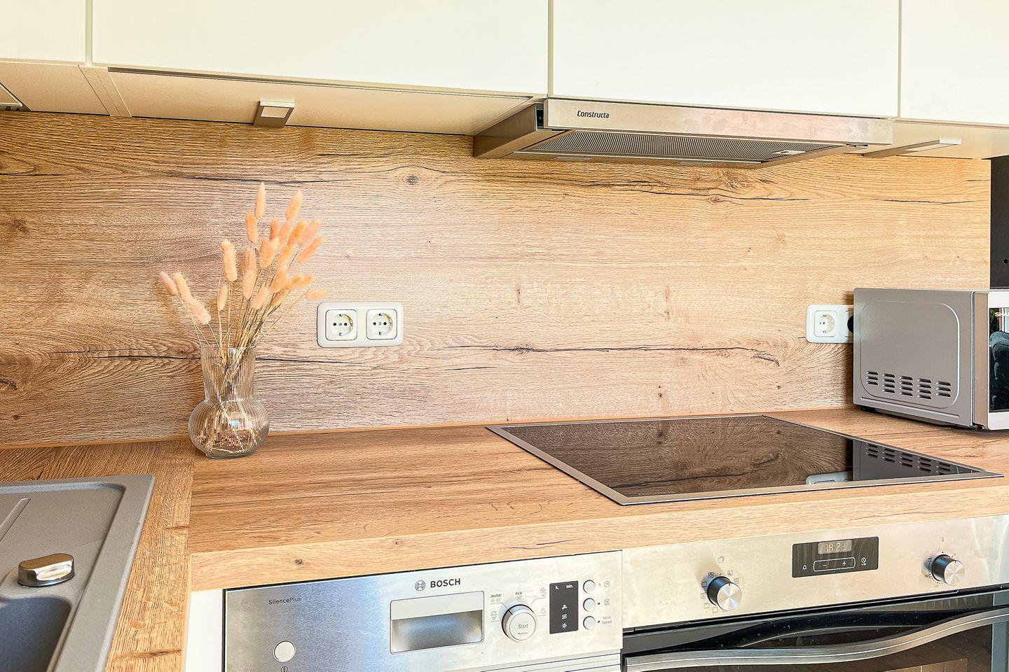 In der Küche sind eine Mikrowelle, ein Induktionskochfeld (4 Felder), ein Backofen und ein Kühlschrank mit Gefrierfach vorhanden. Der Boden ist in der gesamten Wohnung mit Designbelag ausgelegt. Der Küchenbereich und das Bad sind gefliest.