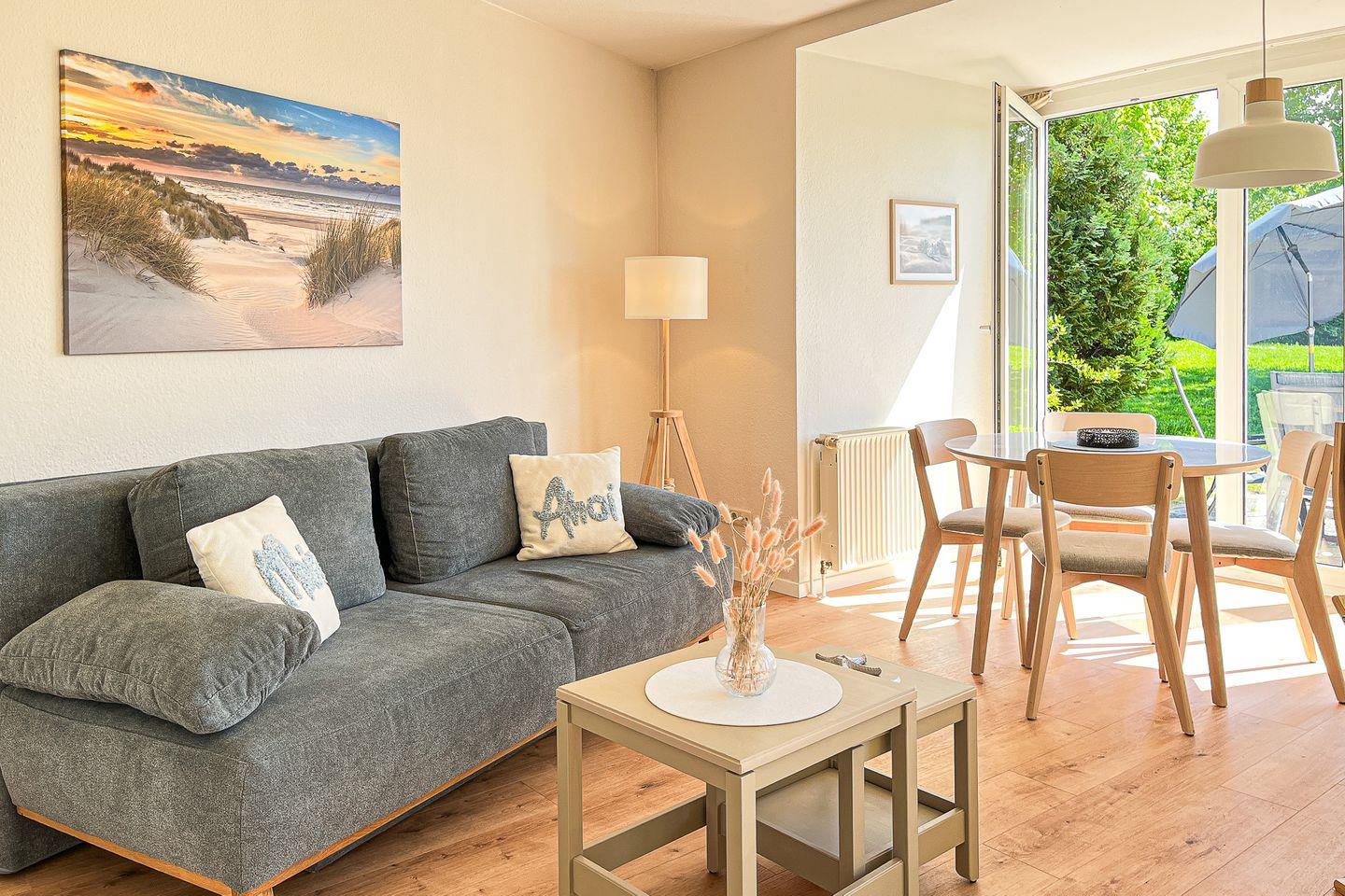 Über den Wohnbereich gelangst du auf die möblierte Terrasse. Das Wohnzimmer sorgt mit einem bequemen Schlafsofa (180 x 200 cm) und einem Esstisch für vier Personen für Gemütlichkeit. Zum Zeitvertreib dient ein 50 Zoll Flachbild-TV sowie ein Radio.