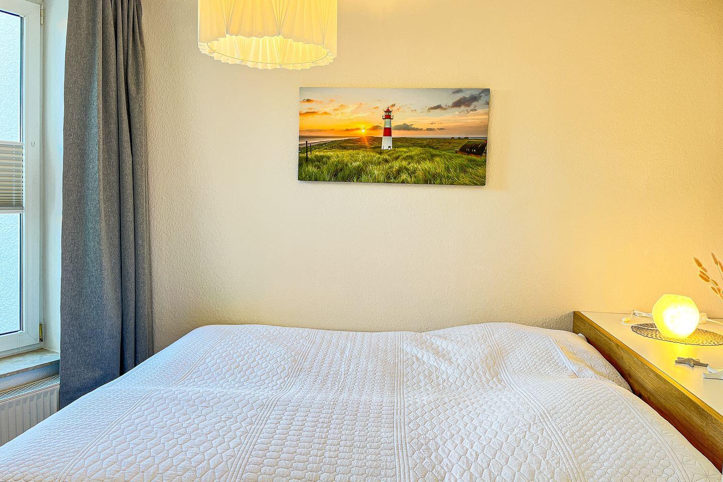 Das Schlafzimmer ist mit einem Doppelbett (180 x 200 cm) ausgestattet. Das Fenster kann mit einem Plissee und Vorhängen verdunkelt werden. Die Urlaubsgarderobe kann im Kleiderschrank und in der Kommode im Wohnzimmer verstaut werden.
