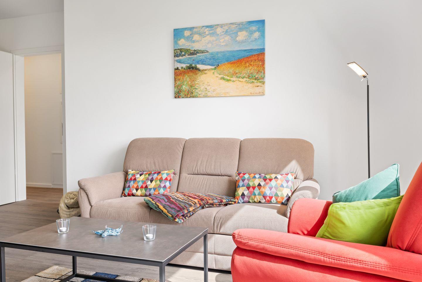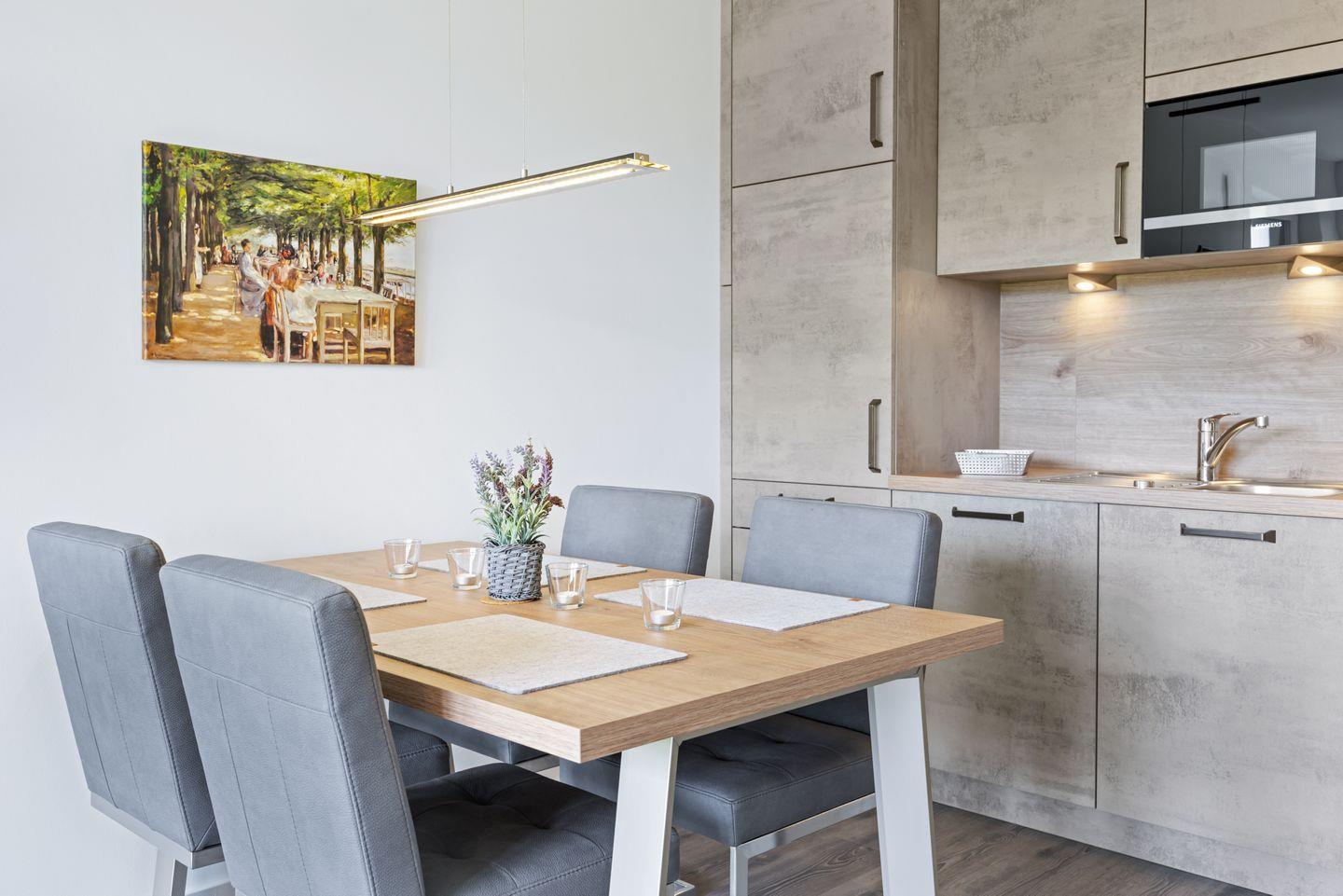 Das moderne und barrierearm konzipierte Nichtraucher-Apartment verfügt über Fußbodenheizung, bodentiefe Fenster, kostenfreies WLAN und eine hochwertige und voll ausgestattete offene Küche mit 4-Felder-Ceranherd, Backofen, Mikrowelle, Geschirrspüler, Kühlschrank mit Gefrierfach, Kaffeemaschine, Toaster und Wasserkocher.
