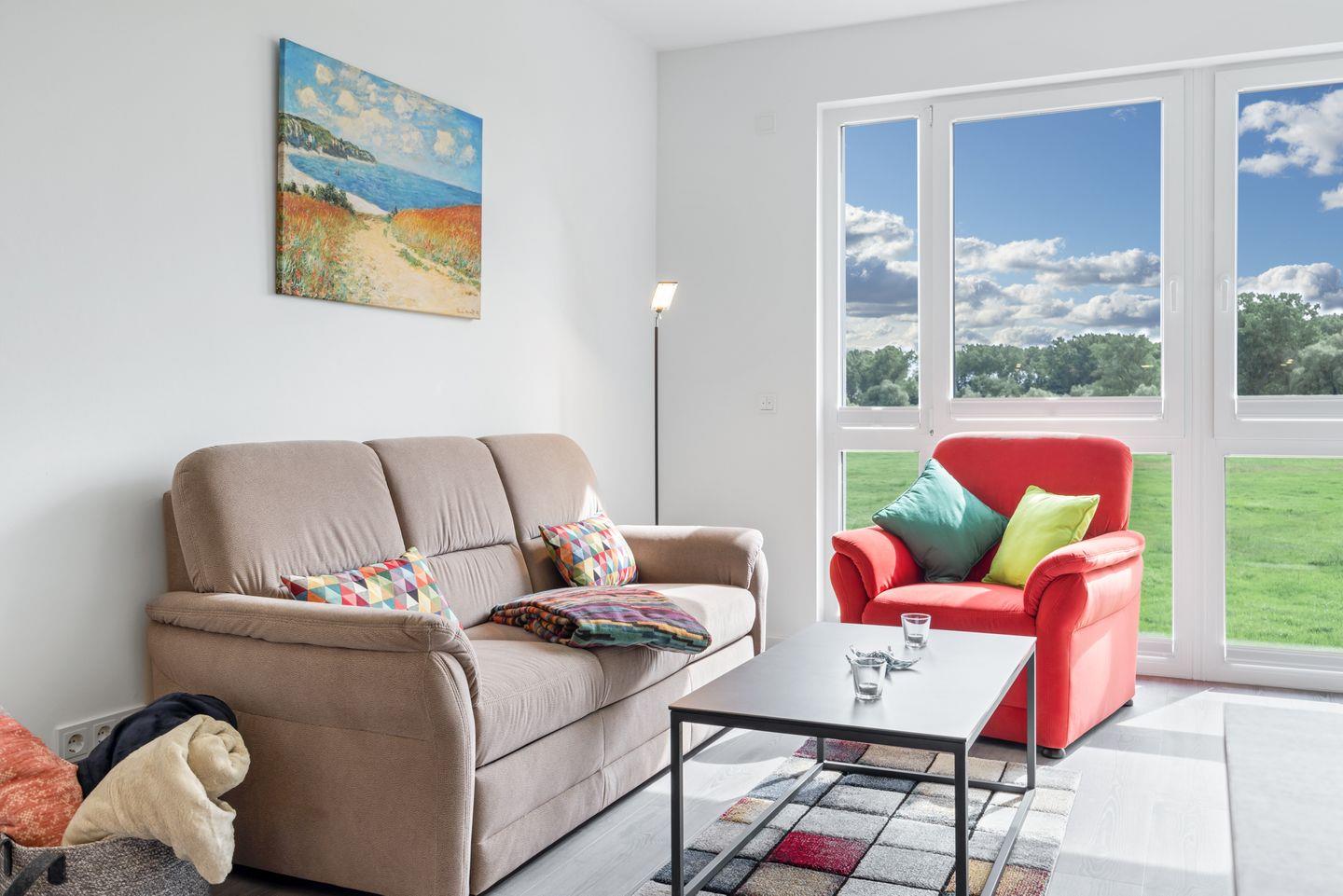 Das 61 m² große und exklusive 2-Zimmer Apartment ist für bis zu 4 Personen geeignet. Besonders hervorzuheben ist die hochwertige Ausstattung und der großzügige und sonnige Balkon; hier könnt ihr den wunderschönen Landblick und das milde Klima der Ostsee in vollen Zügen genießen.