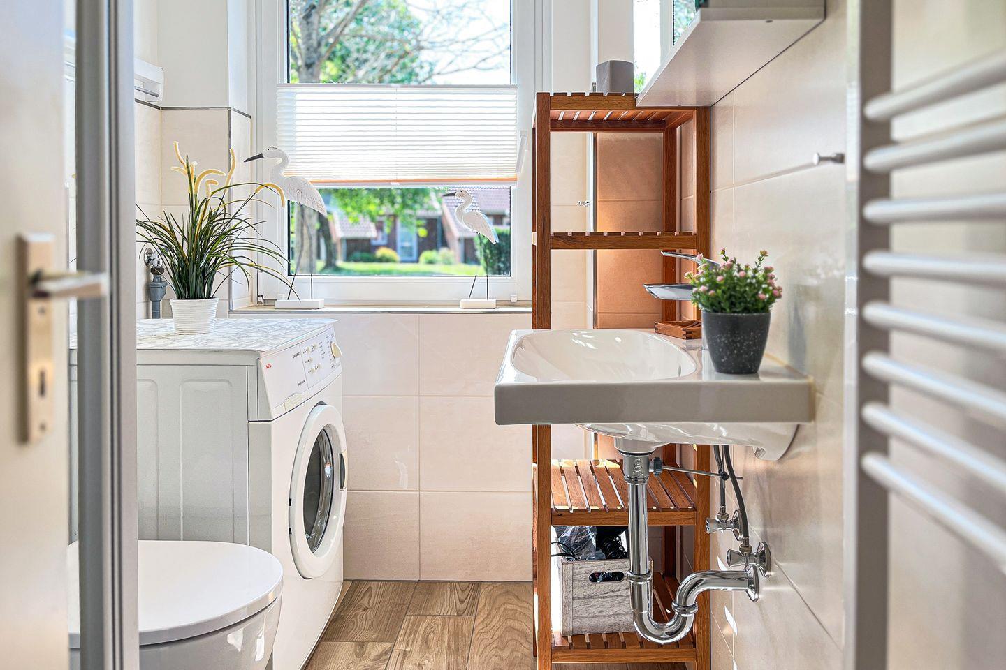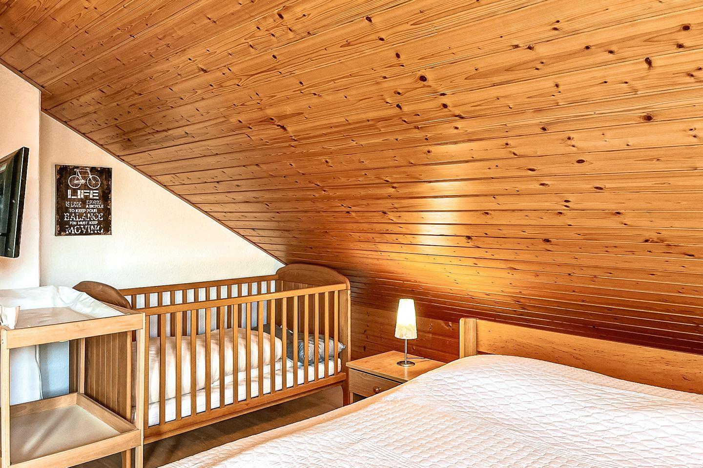 Das Duschbad im Erdgeschoss hat eine Dusche. Ein Gäste-WC findest du im Dachgeschoss vor. Dieses erreichst du über das Schlafzimmer mit Doppelbett. Zu diesem Ferienhaus gehört eine Waschmaschine. Der Boden wurde im Erdgeschoss mit Fliesen ausgelegt. Der Schlafraum im Dachgeschoss ist mit Laminat versehen. In dieser Nichtraucherwohnung sind Haustiere nicht erlaubt.