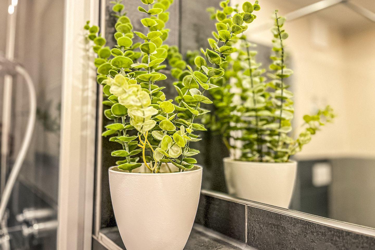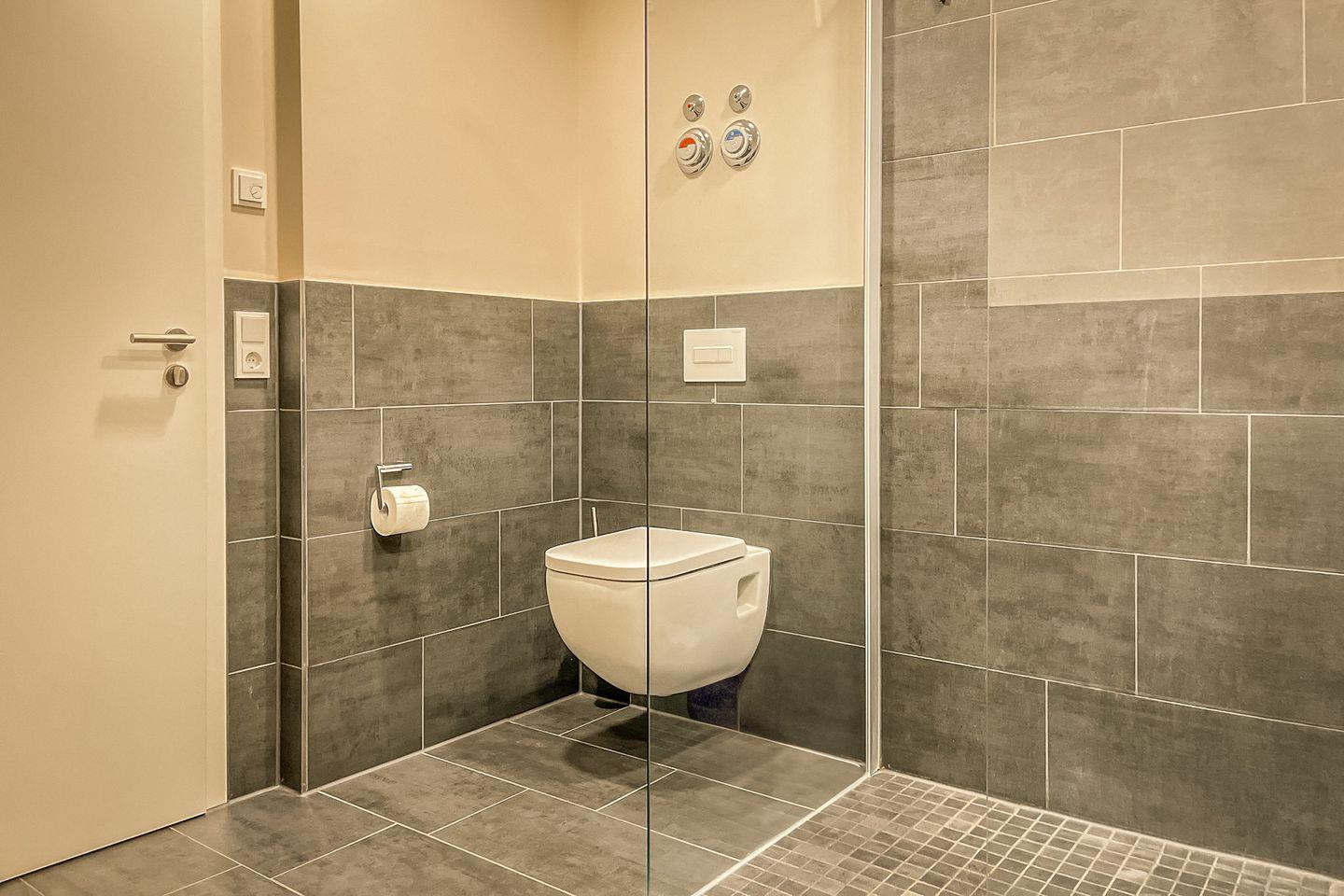 Das modern gestaltete Badezimmer verfügt über eine bodengleiche Dusche, WC, Waschbecken, Kosmetikspiegel und Haartrockner.