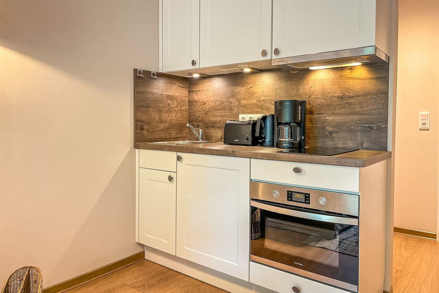 Die offen integrierte Küche ist vollständig ausgestattet mit Cerankochfeld, Backofen, Kühlschrank mit Gefrierfach, Kaffeemaschine, Toaster und Wasserkocher. Auch Kochutensilien und Geschirr sind in ausreichender Zahl vorhanden.
