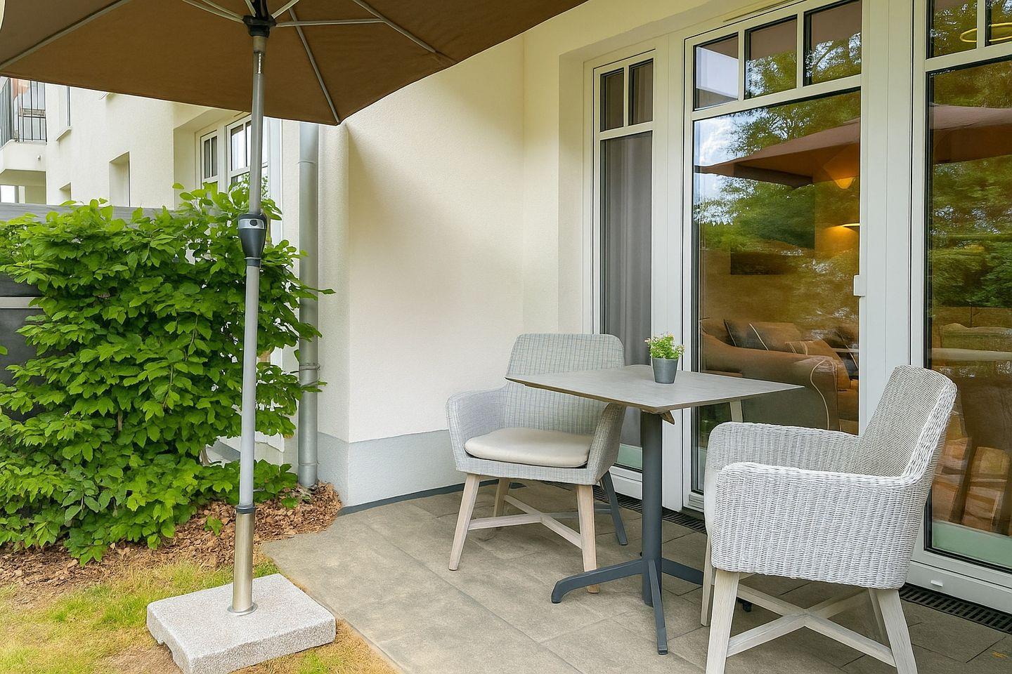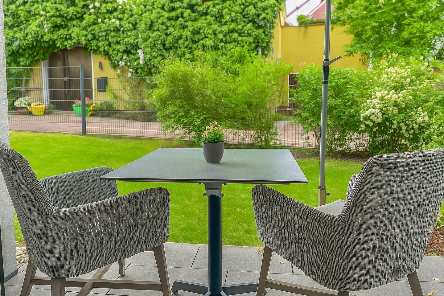 Ein besonderes Highlight ist die Terrasse mit Gartenmöbeln und Sonnenschirm – perfekt für ein Frühstück an der frischen Luft oder ein Glas Wein am Abend.
