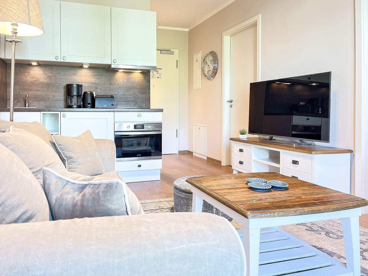 Im offenen Wohnbereich sorgen ein gemütliches Sofa und ein Flachbild-TV für entspannte Stunden. Der angrenzende Essplatz bietet Platz für zwei Personen und fügt sich harmonisch in den Raum ein.