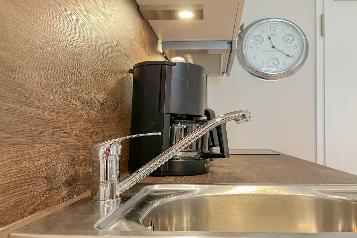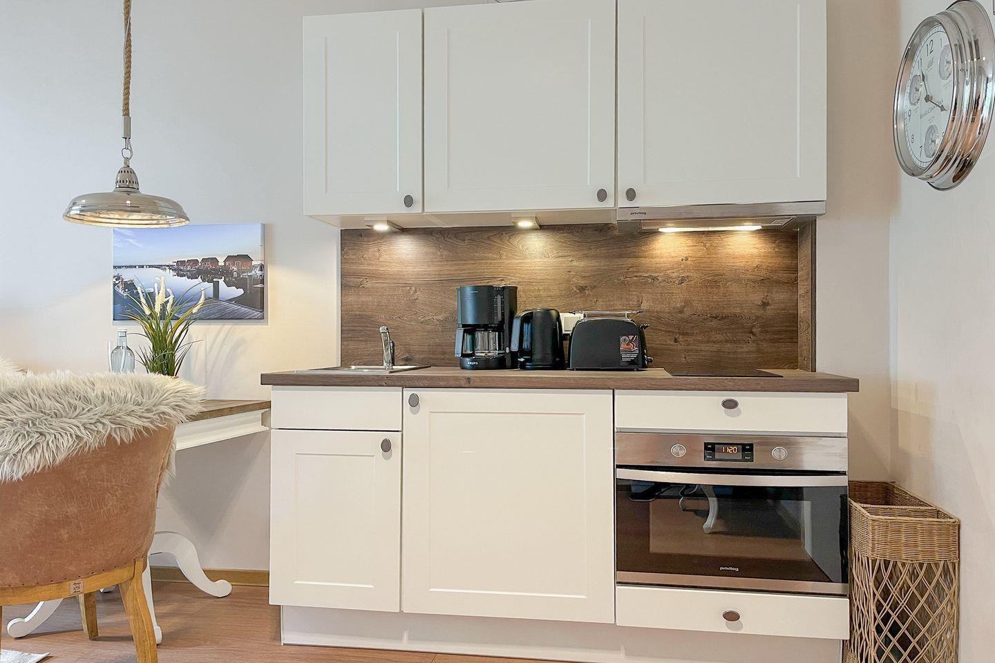 Die Küche ist offen zum Wohnbereich gestaltet und mit Cerankochfeld, Backofen, Kühlschrank mit Gefrierfach, Kaffeemaschine, Wasserkocher, Toaster sowie allen notwendigen Küchenutensilien ausgestattet – perfekt für Selbstversorger.