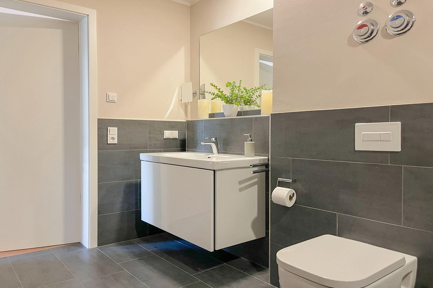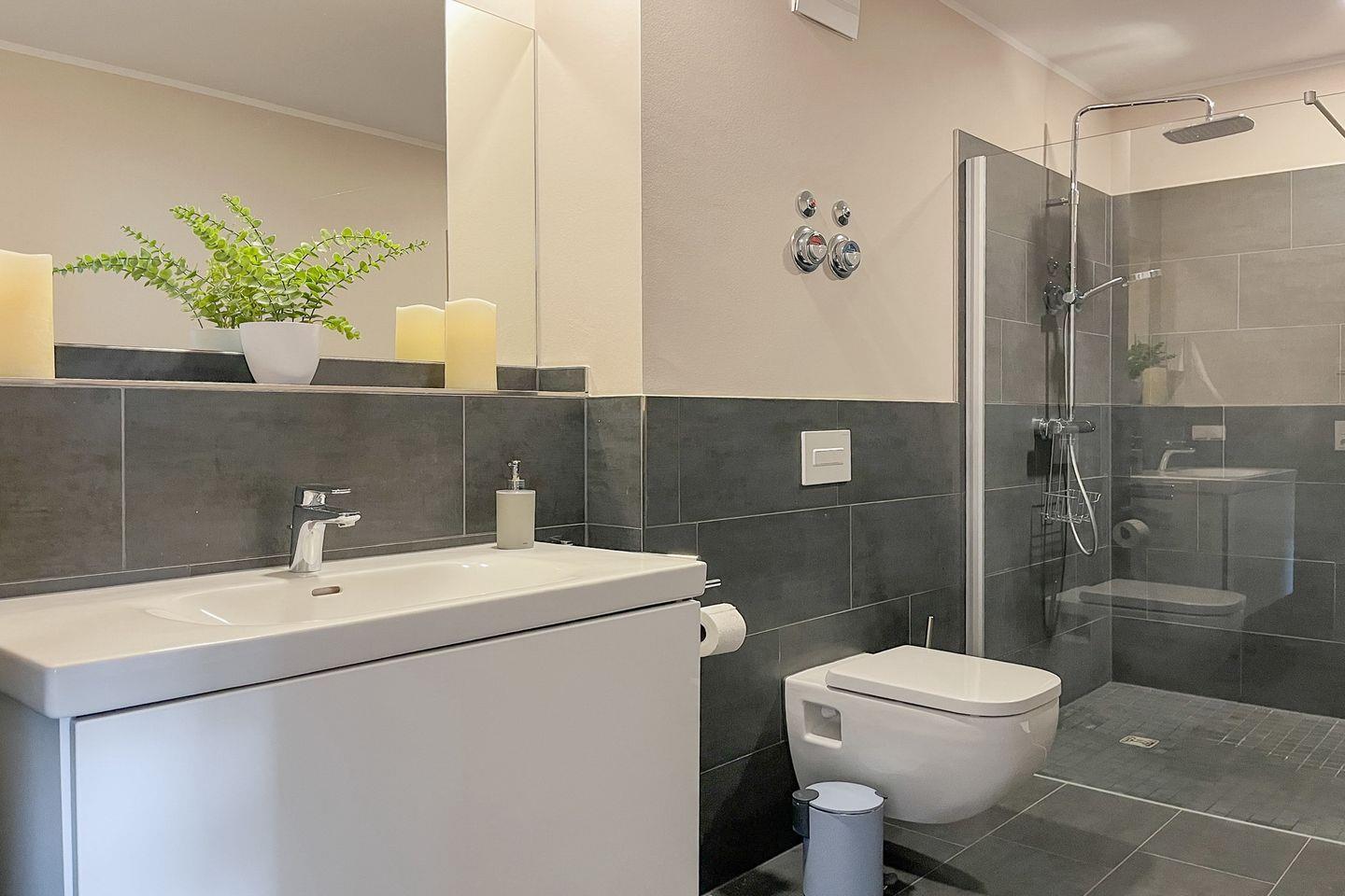 Das moderne Badezimmer ist mit einer bodengleichen Dusche, WC, Waschbecken, Kosmetikspiegel und einem Haartrockner ausgestattet.