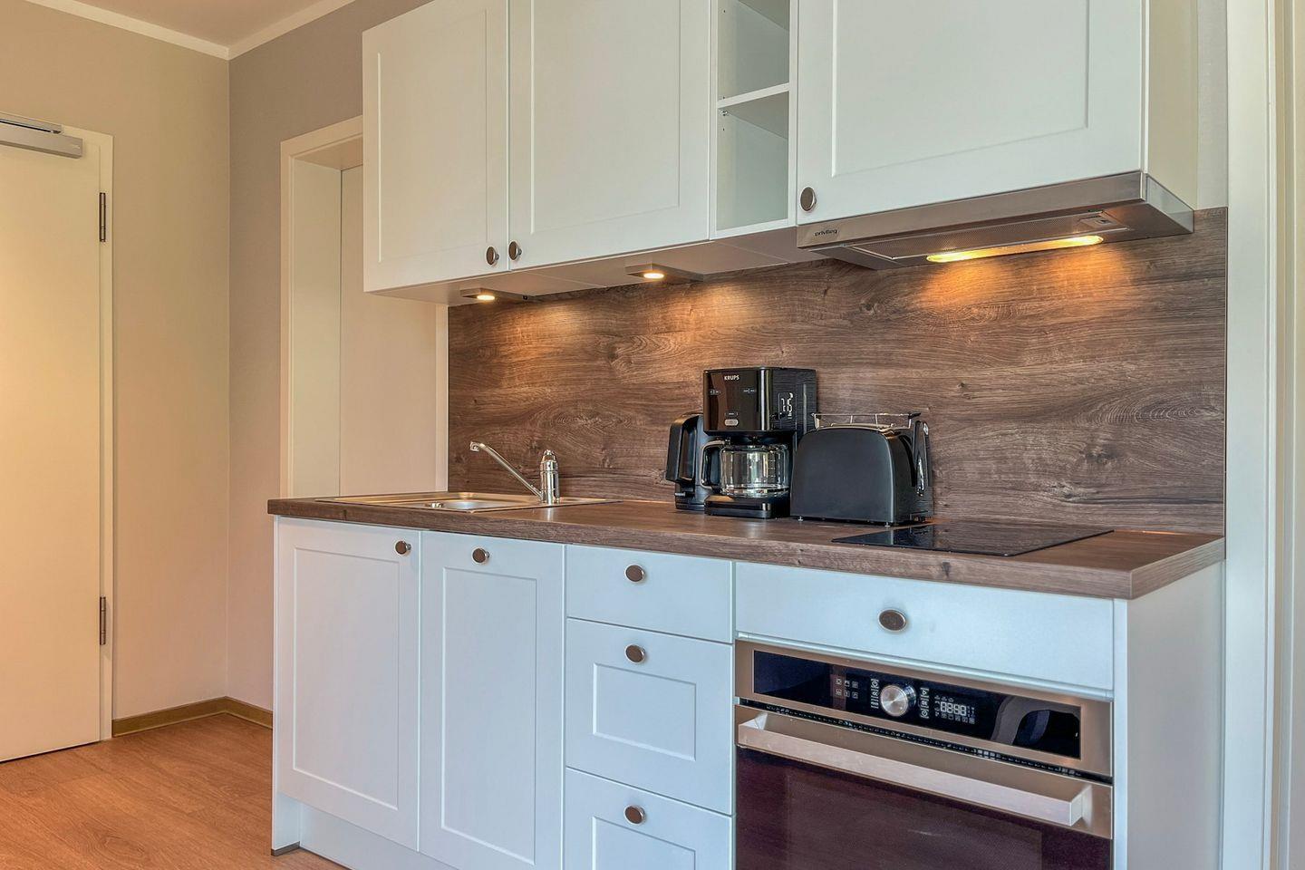 Die offene Küche ist bestens ausgestattet: Cerankochfeld, Backofen, Kühlschrank mit Gefrierfach, Spülmaschine, Kaffeemaschine, Wasserkocher, Toaster sowie alle wichtigen Küchenutensilien und Geschirr stehen zur Verfügung.