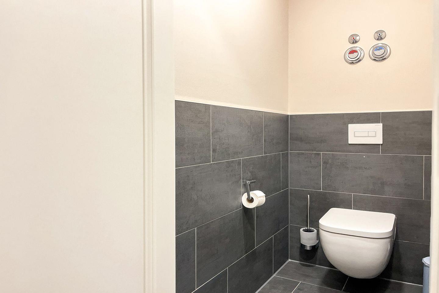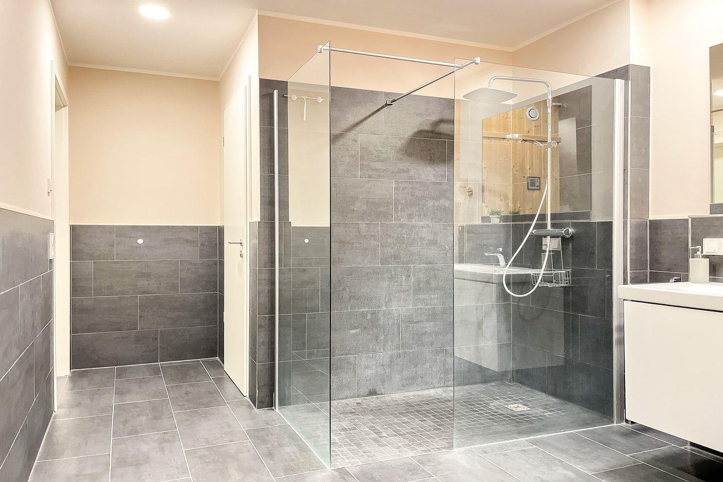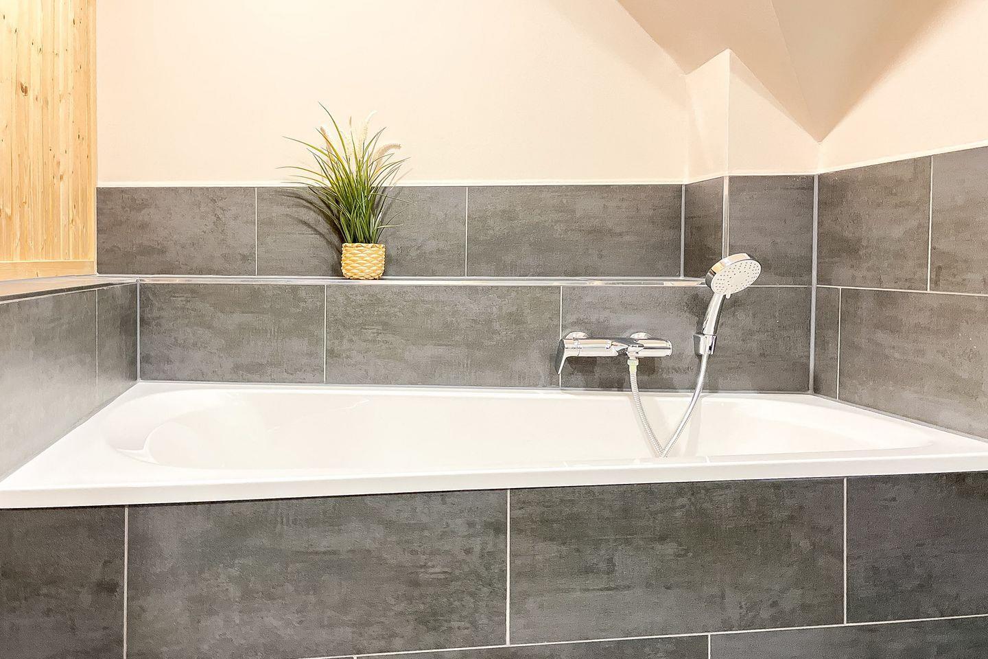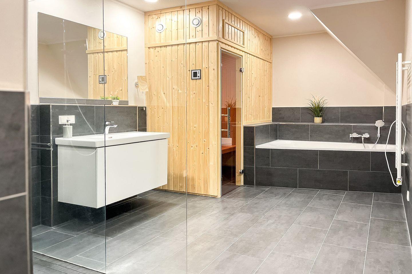 Das moderne Badezimmer verfügt über eine bodengleiche Dusche, Badewanne, WC, Waschbecken, Kosmetikspiegel und Haartrockner – ideal für Deinen Start in den Tag oder entspannte Momente am Abend.