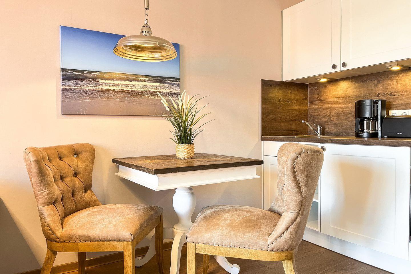 Die offene Küche ist hochwertig ausgestattet: Cerankochfeld, Backofen, Kühlschrank mit Gefrierfach, Kaffeemaschine, Wasserkocher, Toaster, Küchenutensilien sowie Geschirr und Besteck stehen bereit – perfekt für Deine Selbstverpflegung.
