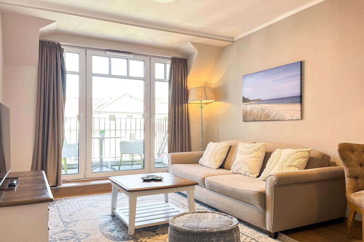 Die Ferienwohnung Nr. 61 in der strandnahen Anlage Baltischer Hof ist eine 2-Zimmer-Wohnung für bis zu 2 Personen und liegt im 2. Obergeschoss. Sie verfügt über ein Wohnzimmer mit integrierter Küchenzeile, ein Bad mit Dusche/Badewanne, private Sauna, ein Schlafzimmer und einen Balkon mit seitlichem Seeblick.