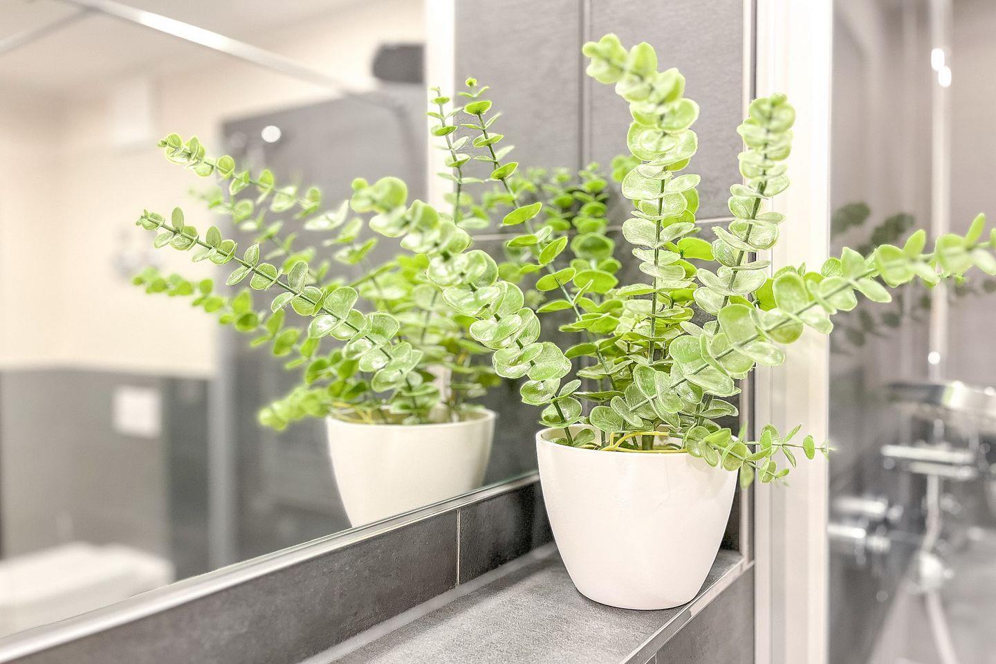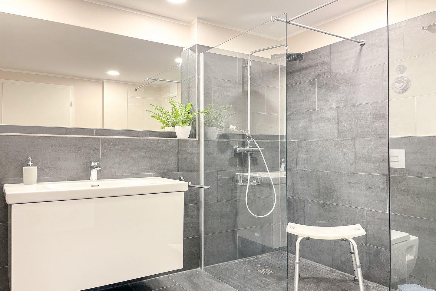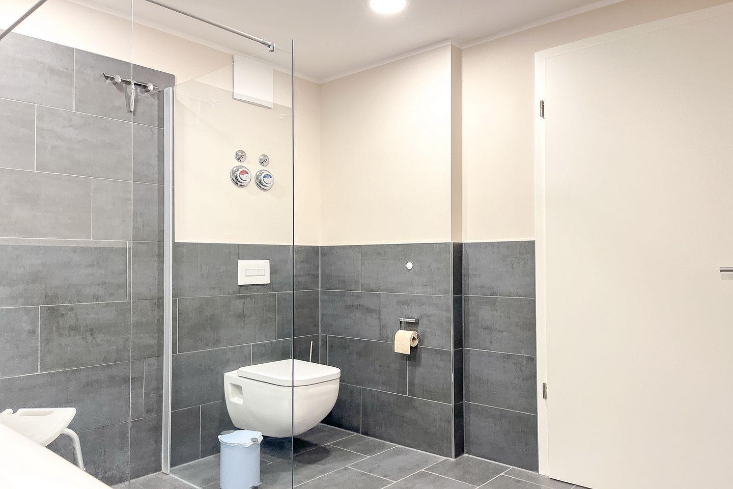 Das moderne Badezimmer ist mit einer bodengleichen Dusche, WC, Waschbecken, Kosmetikspiegel und Haartrockner ausgestattet – alles für einen angenehmen Start in den Tag.