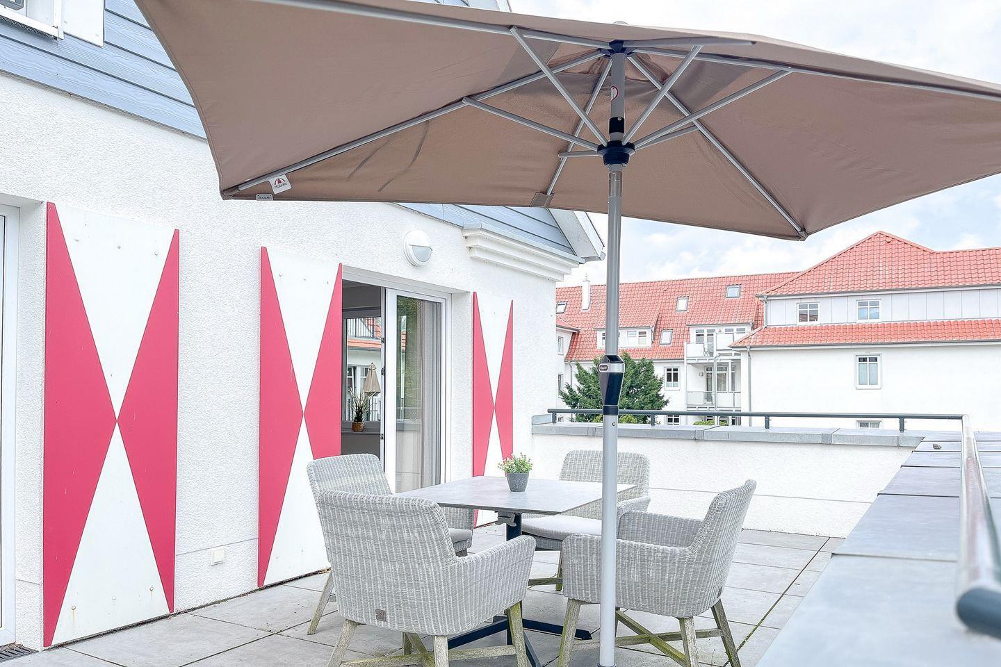 Ein Balkon mit Gartenmöbeln und Sonnenschirm lädt zum Verweilen im Freien ein – perfekt für ein Frühstück in der Morgensonne oder entspannte Abendstunden mir Meerblick.