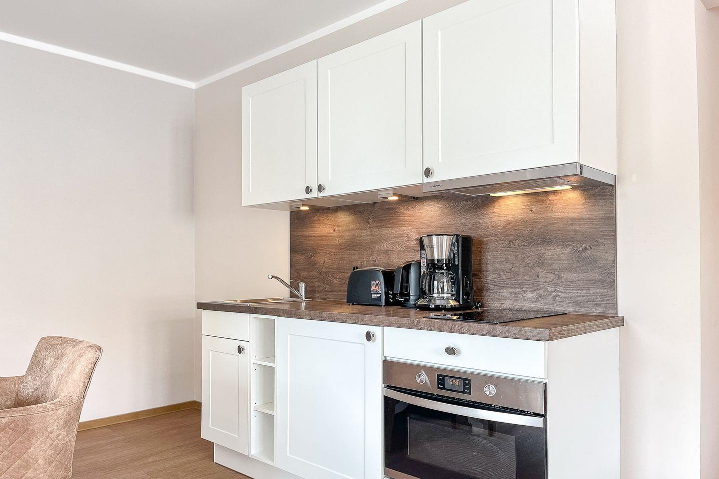 Die integrierte Küche ist mit allem ausgestattet, was Du für Deinen Aufenthalt benötigst: Cerankochfeld, Backofen, Kühlschrank mit Gefrierfach, Kaffeemaschine, Wasserkocher, Toaster sowie Kochutensilien und Geschirr.
