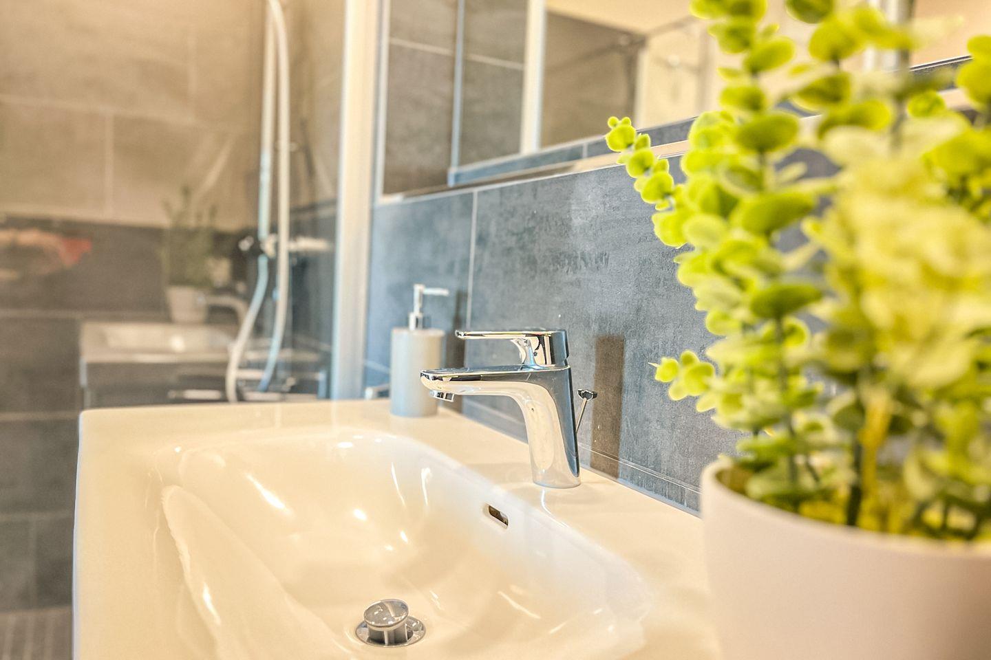 Das Badezimmer ist mit bodengleicher Dusche, WC, Waschbecken, Kosmetikspiegel und Haartrockner ausgestattet – alles für Deinen täglichen Komfort.