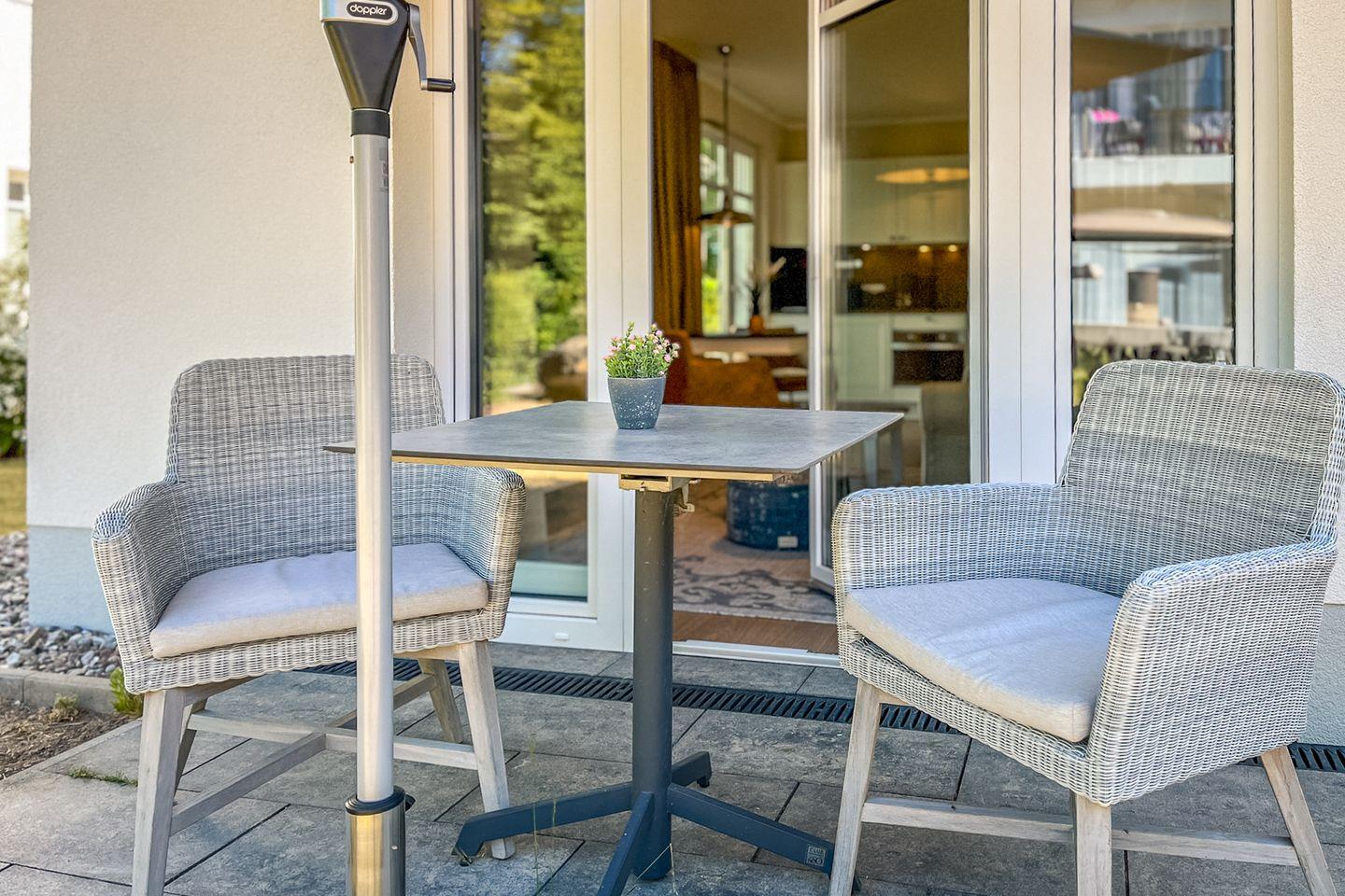 Ein besonderes Highlight ist die Terrasse mit Gartenmöbeln und Sonnenschirm – der perfekte Ort für ein Frühstück im Freien oder entspannte Stunden im Grünen.