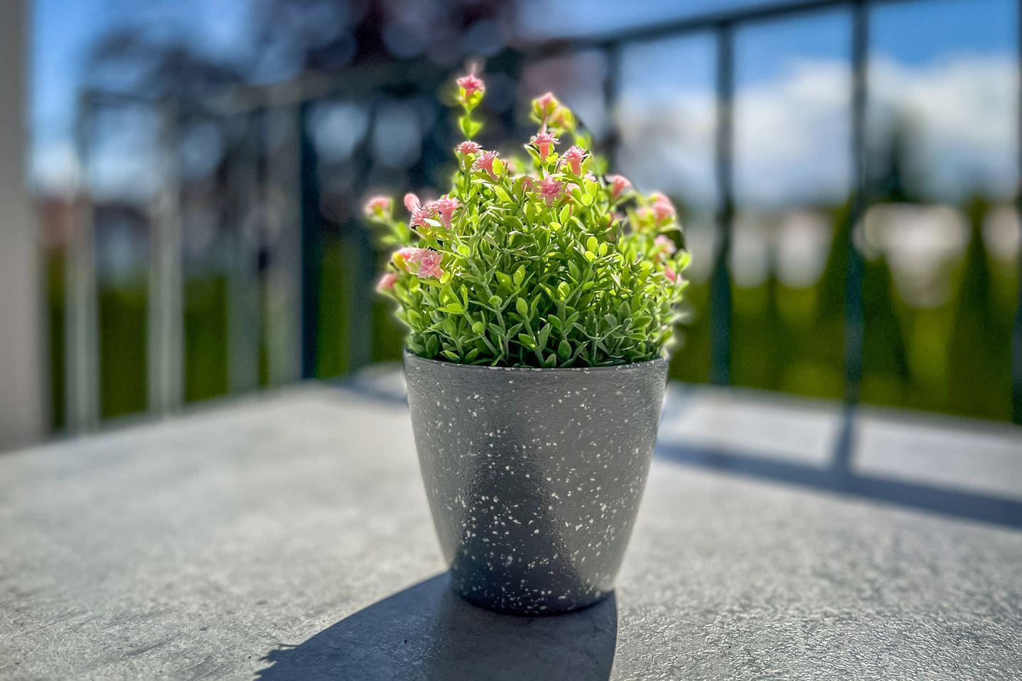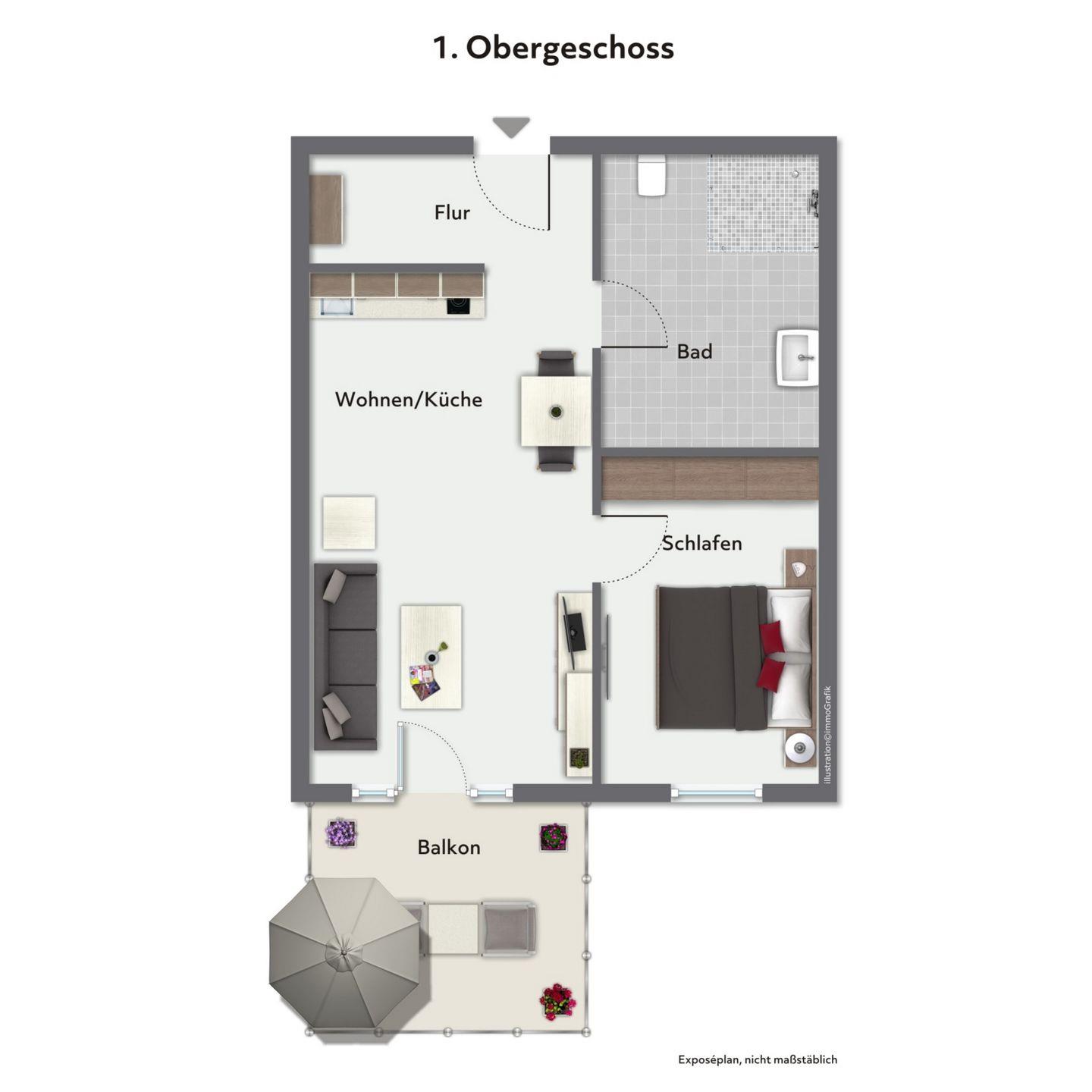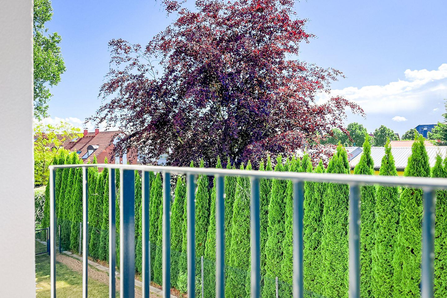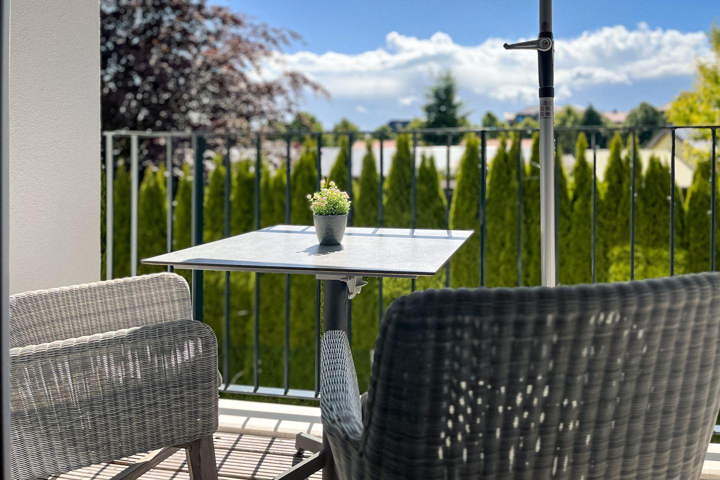 Ein Balkon mit Gartenmöbeln und Sonnenschirm lädt zum Verweilen im Freien ein – perfekt für ein Frühstück in der Morgensonne oder entspannte Abendstunden.